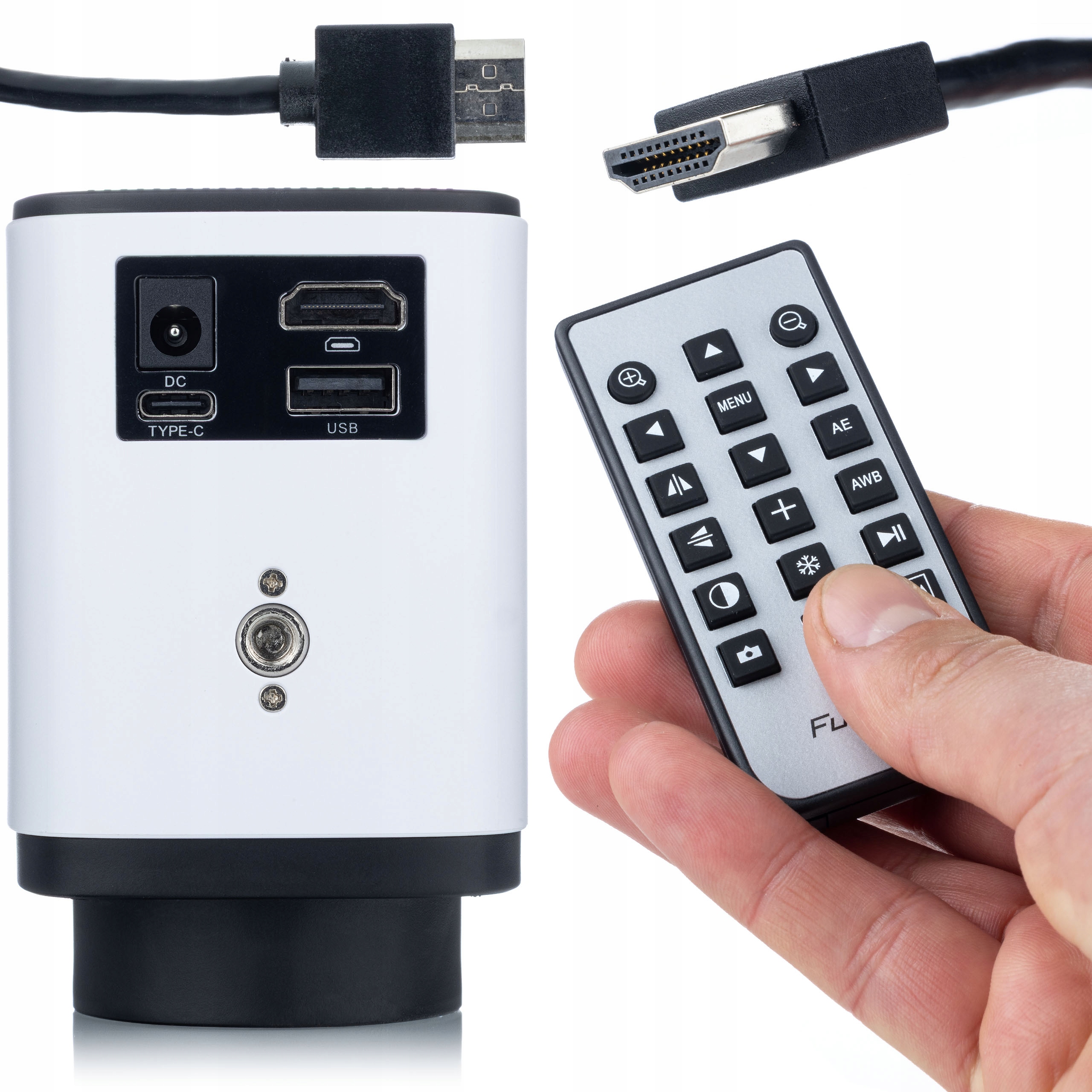 Wszystkie ustawienia mogą być zmieniane za pomocą pilota zdalnego sterowania, bez potrzeby dotykania urządzenia. Dzięki temu praca z mikroskopem jest wygodna, szybka i precyzyjna – zarówno przy dokumentacji obrazu, jak i w czasie rzeczywistym.