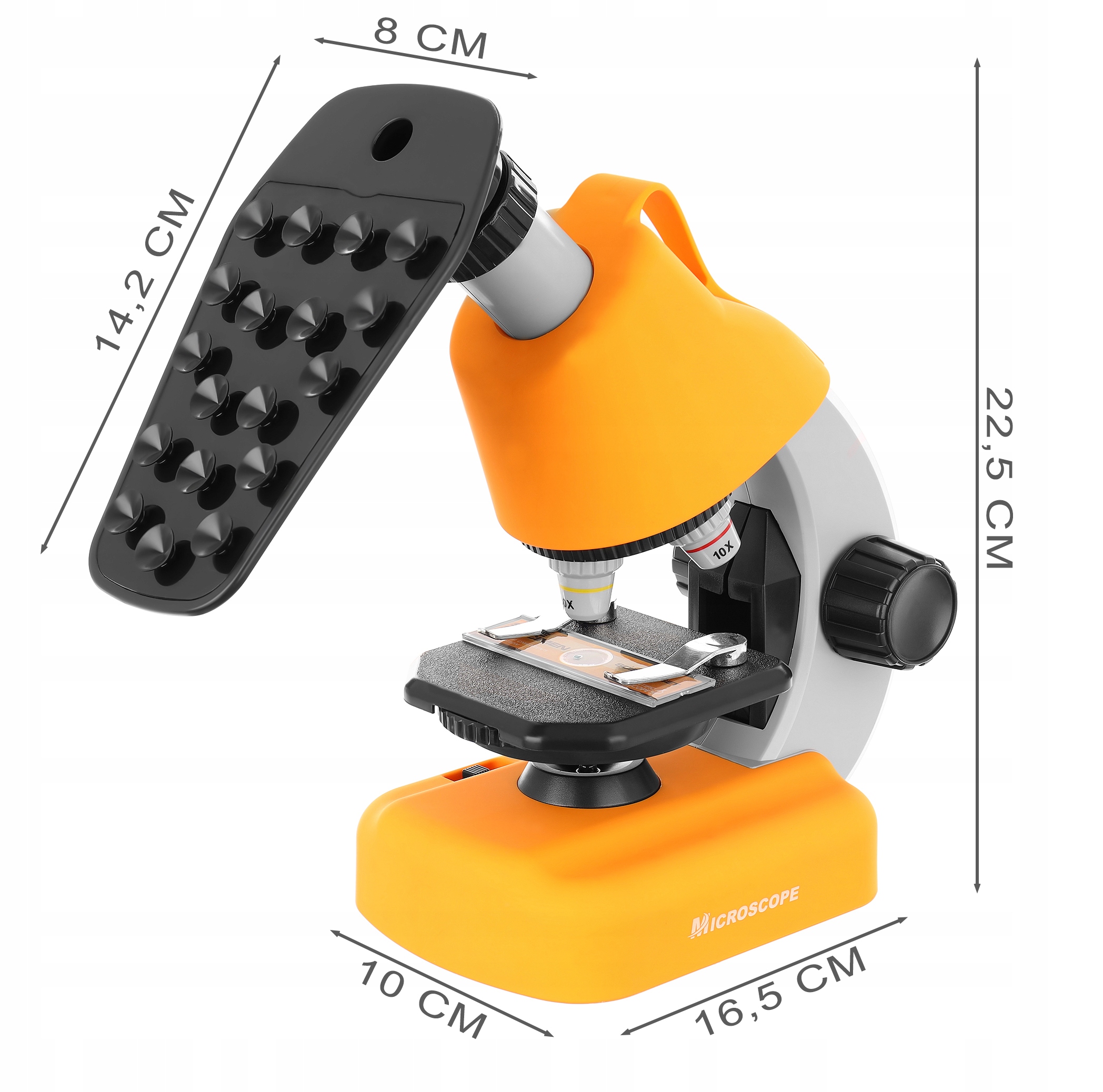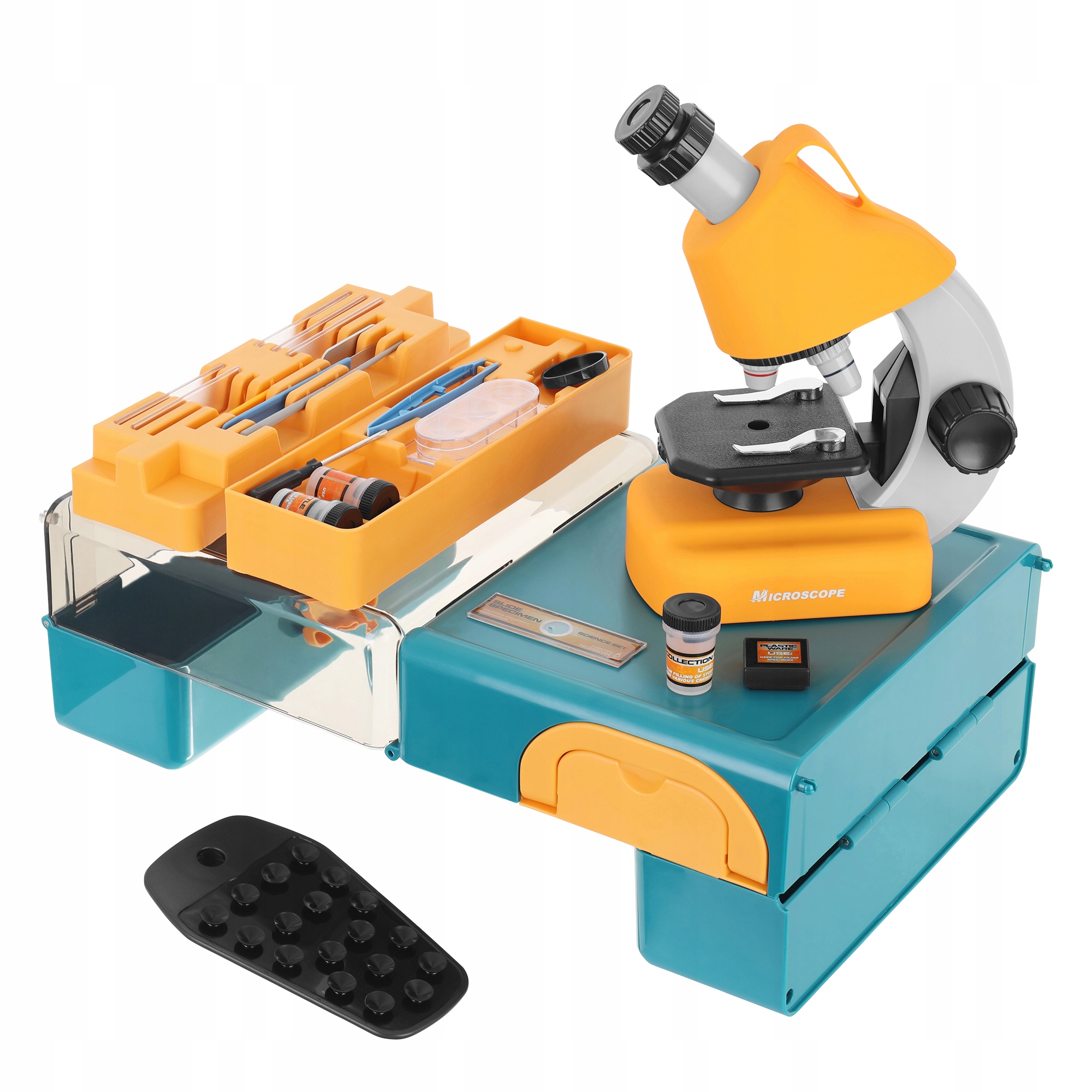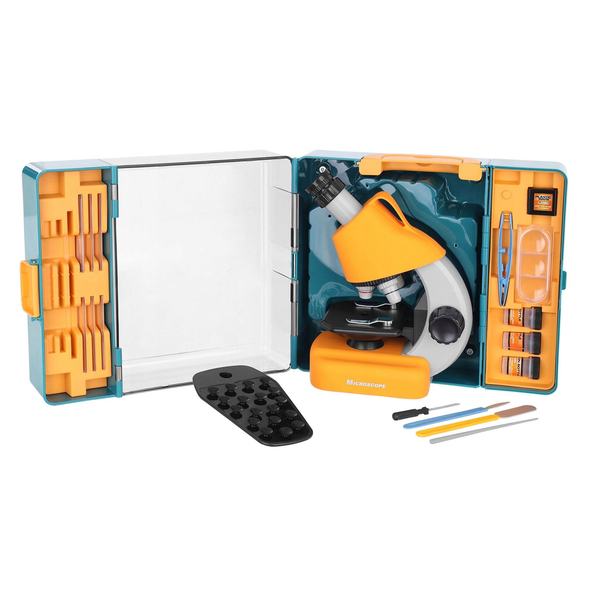 Mikroskop je zaprt v izjemno funkcionalnem etuiju , zahvaljujoč kateremu lahko otrok priročno nosi komplet. Poleg tega ga je mogoče med raziskavo spremeniti v praktično stojalo – opazovalno mizico.
