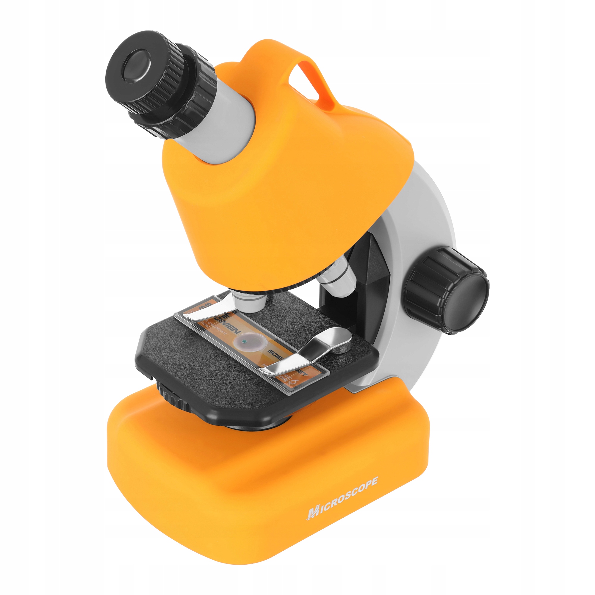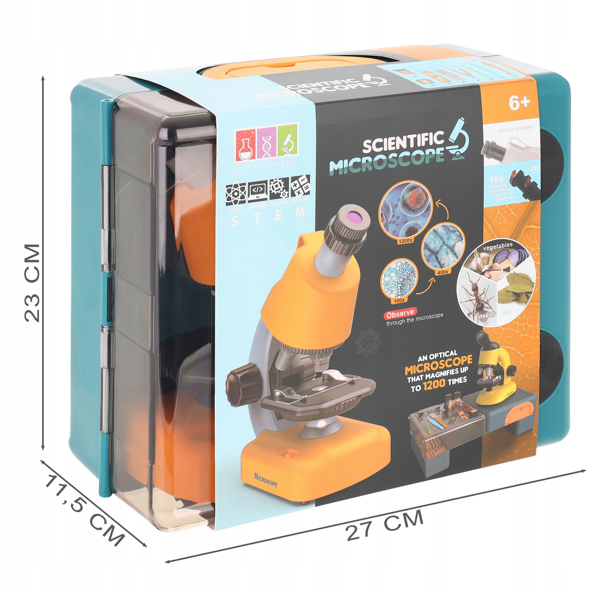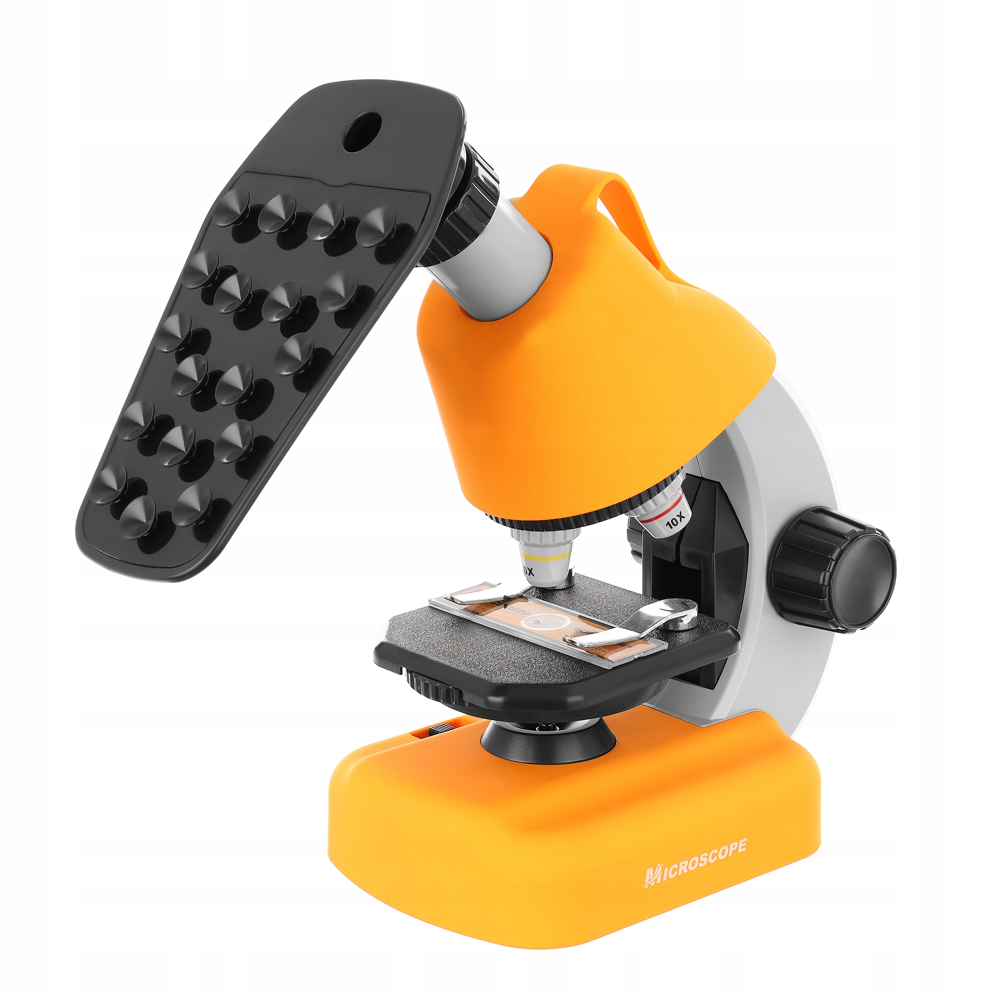 Mikroskop je zaprt v izjemno funkcionalnem etuiju , zahvaljujoč kateremu lahko otrok priročno nosi komplet. Poleg tega ga je mogoče med raziskavo spremeniti v praktično stojalo – opazovalno mizico.