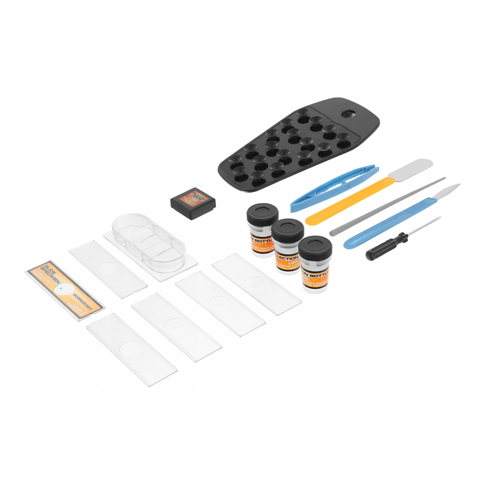 Komplet vsebuje: dodatke, ki bodo zagotovo olajšali opazovanja . Z njihovo pomočjo lahko zberete vzorce in jih položite na posebna stekelca. Dobra priprava na raziskavo je bistvenega pomena!