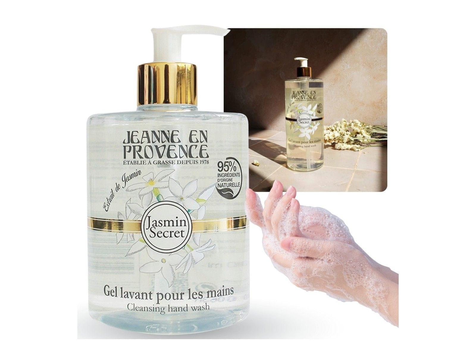 Tekoče milo za roke Jeanne en Provence – Jasmin Secret združuje edinstveno čistilno formulo z negovalnimi notami za kožo.