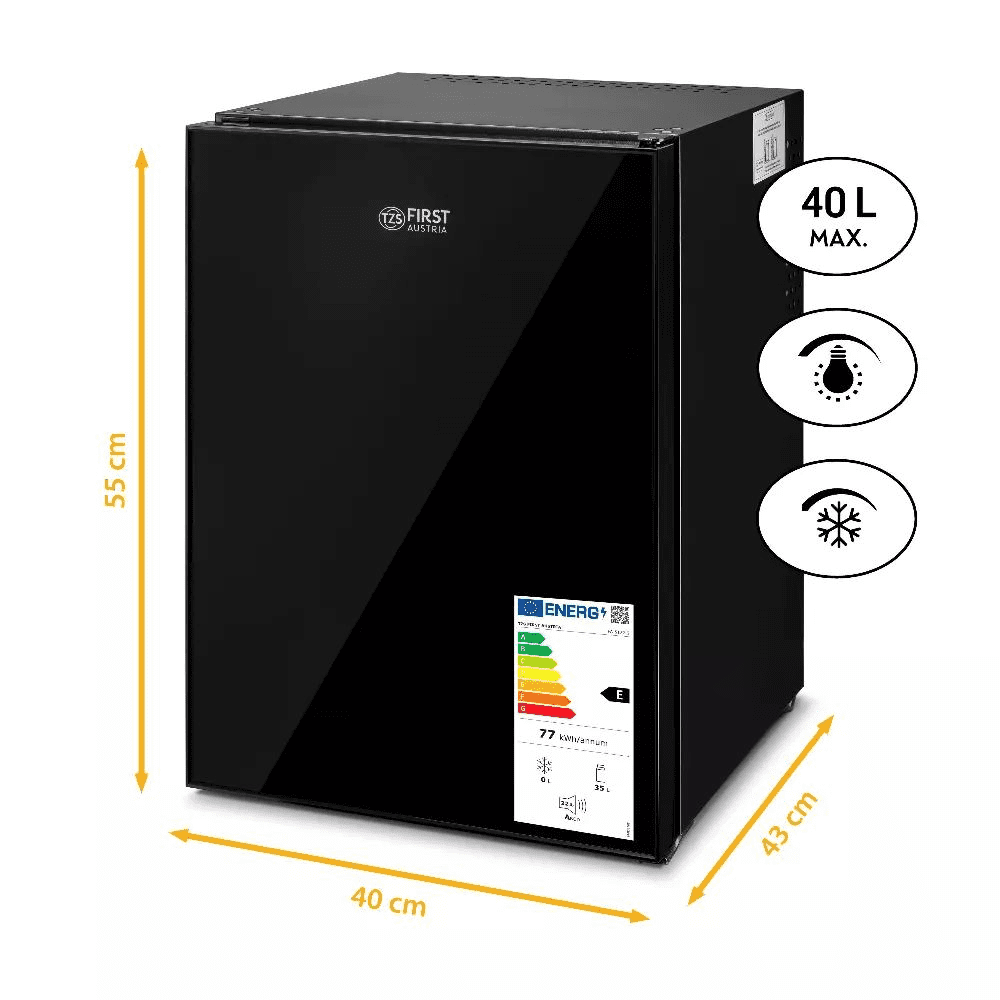 First Austria Hladilnik mini FIRST 35/40L, 22dB, ER: E, črne barve, steklena sprednja stran