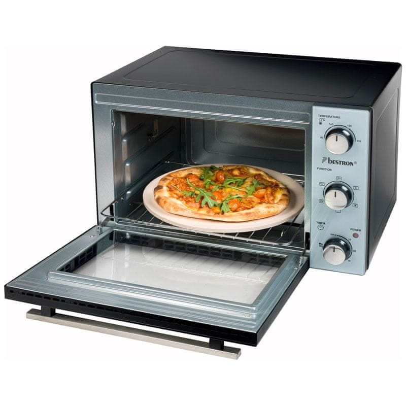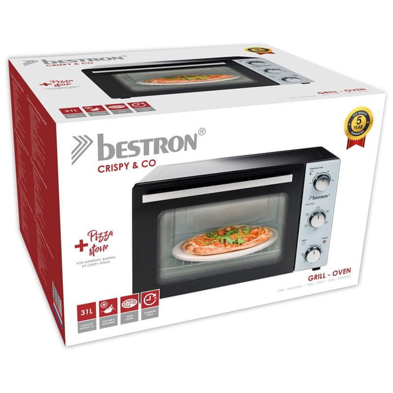 Mini pečica na vroč zrak Bestron ponuja 31 l prostornine, šest načinov gretja in nastavljivo temperaturo vse do 230° C. Priložen je tudi vrtljivi raženj za meso in perutnino, skupaj s kamnom za peko pice s premerom 30,5 cm, rešetko za žar, emajliranim pladnjem za peko in priročnim ročajem za odstranjevanje.