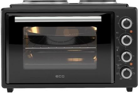 Majhno stanovanje, vikend, pisarna, trgovina in študentski dom. Vse to so mesta, kjer vam lahko dobro služi namizna pečica z električnimi kuhališči ECG ETH 3501B. Gre za kompakten aparat, ki vam omogoča kuhanje, cvrenje ali peko tudi tam, kjer nimate na voljo klasične kuhinje. Samo postavite ga na mizo in ga s kablom dolžine 90 cm priključite v standardno vtičnico – ko to storite, lahko uporabljate pečico s prostornino 35 litrov in močjo 1400 W ter 2 električni kuhalni plošči s 3 stopnjami nastavitve (premera 180 mm in 145 mm, moč 1500 W in 1000 W). Obenem je koristno, da aparat omogoča hkratno uporabo pečice in enega od kuhališč. Pečica v tej različici je elegantnega črnega dizajna in ima dimenzije 41,6 × 50,5 × 33,05 cm. Je praktičen aparat, ki vam omogoča pripravo odličnih obrokov v vsakem okolju.