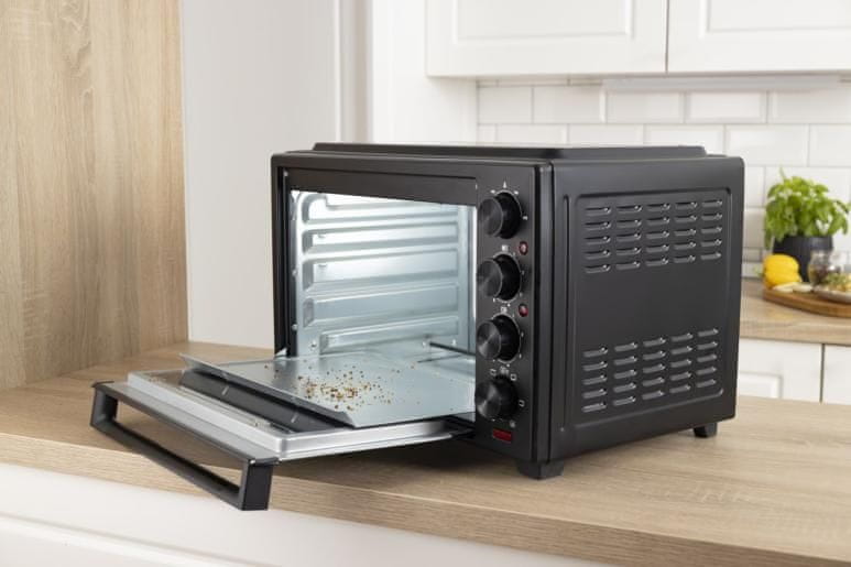 Z radodarno prostornino 38 litrov in štirimi nivoji pečenja lahko pripravljate več jedi hkrati, kar je idealno za družinska kosila. Konvekcijska tehnologija z vgrajenim ventilatorjem poskrbi, da vroč zrak enakomerno kroži po notranjosti, zato bo hrana vedno hrustljava zunaj in sočna znotraj. Integrirani senzor vam omogoča natančno nastavitev temperature od 100 °C do 230 °C, medtem ko intuitivni vrtljivi gumbi zagotavljajo popoln nadzor nad vsemi funkcijami.
