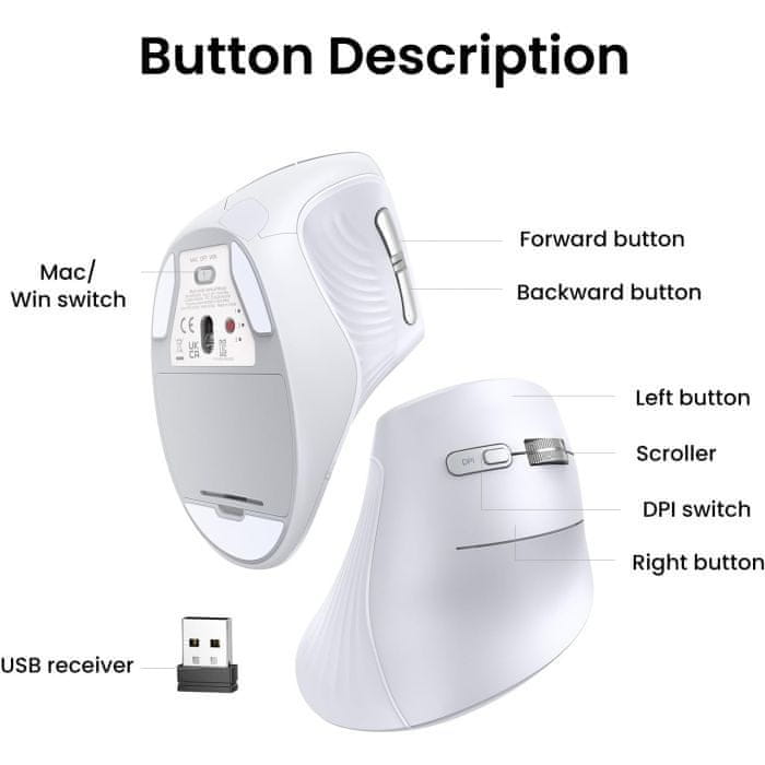 Ugreen Brezžična ergonomska vertikalna miška z Bluetooth in Wi-Fi povezavo - bela