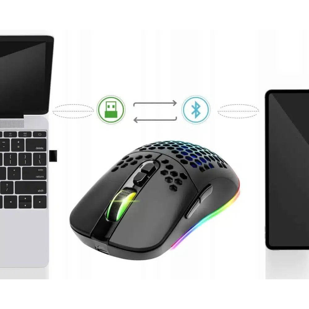 Igralna miška – brezžična povezava 2,4 G/Bluetooth, RGB osvetlitev ozadja (11 načinov), DPI 1600–3200, 6 programabilnih gumbov, optični senzor, tihi kliki, baterija 400 mAh, mat zaključek, ergonomska oblika za desničarje, doseg 10 m, samodejni preklop v stanje mirovanja Celoten opis