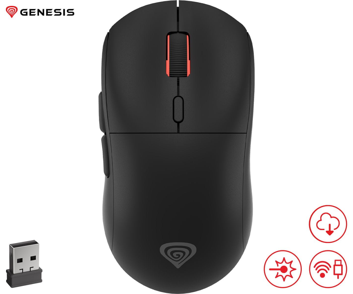 Genesis Zircon XIII brezžična miška, gaming, 26.000DPI, 2.4GHz/USB-C, 7 gumbov, baterija, črna