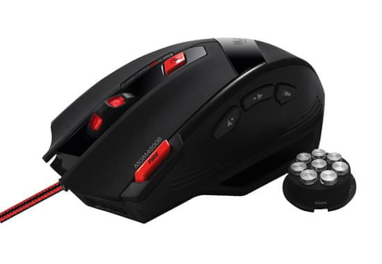Igralna optična miška od blagovne znamke MAX ima ergonomsko obliko, moderno tehnologijo posnemanja in natančno reakcijo ob pritisku na gumbe. Teža miške se lahko upravlja od 151 g do 173 g, zahvaljujoč odstranljivim osem kom. uteži. Kabel za ovijanje z dolžino 1,8 m zagotavlja dolgo življenjsko dobo in enostavno priključitev k vaši igralni napravi. Zelo občutljiv senzor z nastavljivo ločljivosti do 4800dpi omogoča posnemanje na kakršni koli površini. Zahvaljujoč minimalni zamudi na pritisk gumbov bo vedno pripravljen hitro reagirati na dogajanje v igri. Na trupu miške je skupaj sedem gumbov + vrteče se kolesce. Klasična dva gumba, ki sta posebej oblikovana, njuna površina pa je gumirana tako, da se vaši prsti počutijo kot v vati. Razsvetljen vrteči se gumb, ki deluje kot tretji gumb. Poleg tega osnovnega seta imate na razpolago še pet gumbov (Turbo-Fire, premikanje naprej in nazaj, nastavitev razsvetljave ter preklapljanje ločljivosti). Celoten opis