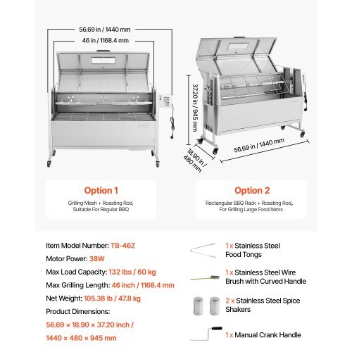 Ta nerjavee terasest pöördgrill on loodud vaevata välistingimustes kokkamiseks sobides ideaalselt terve sea lambaliha kalkuni ning segaliha või köögiviljade röstimiseks. Võimas elektrimootor ja reguleeritavad kõrgustasemed tagavad ühtlased ja järjepidevad tulemused kogunemistel telkimisel või aias pidutsemisel. Selle kaasaskantav disain lukustatavate ratastega ja kergesti puhastatavad komponendid pakuvad mugavust ja mitmekülgsust igal väliüritusel.
