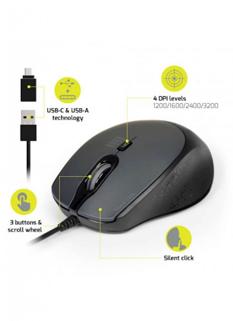 Miška PORT USB-A/USB-C, tiha, črna, 3600 dpi