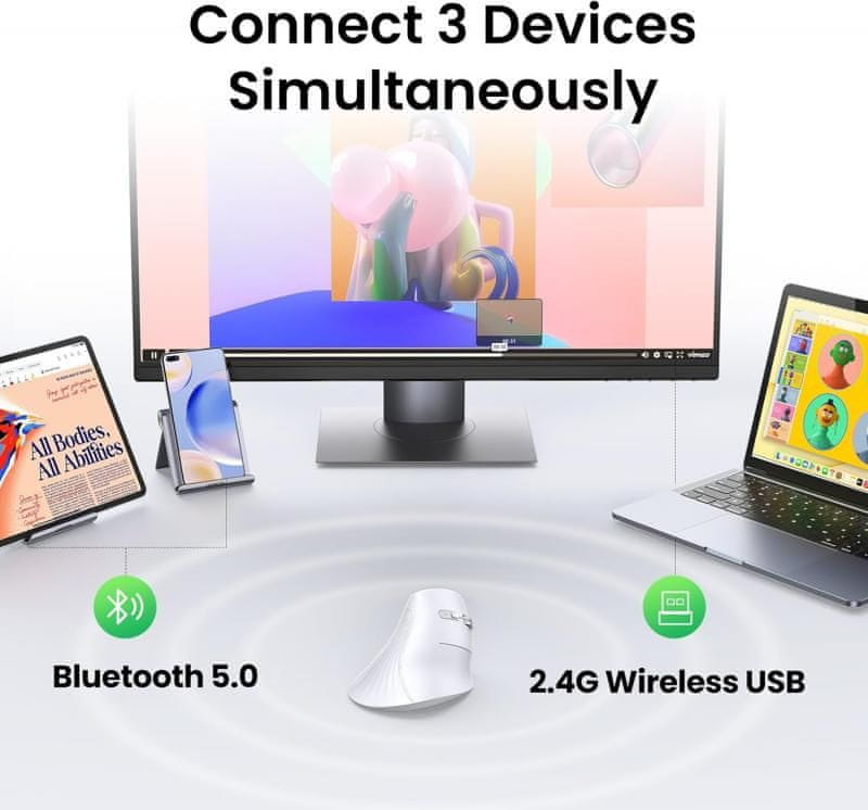Ugreen brezžična ergonomska vertikalna miška z Bluetooth in Wi-Fi povezavo - bela