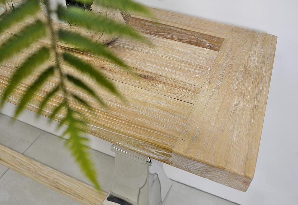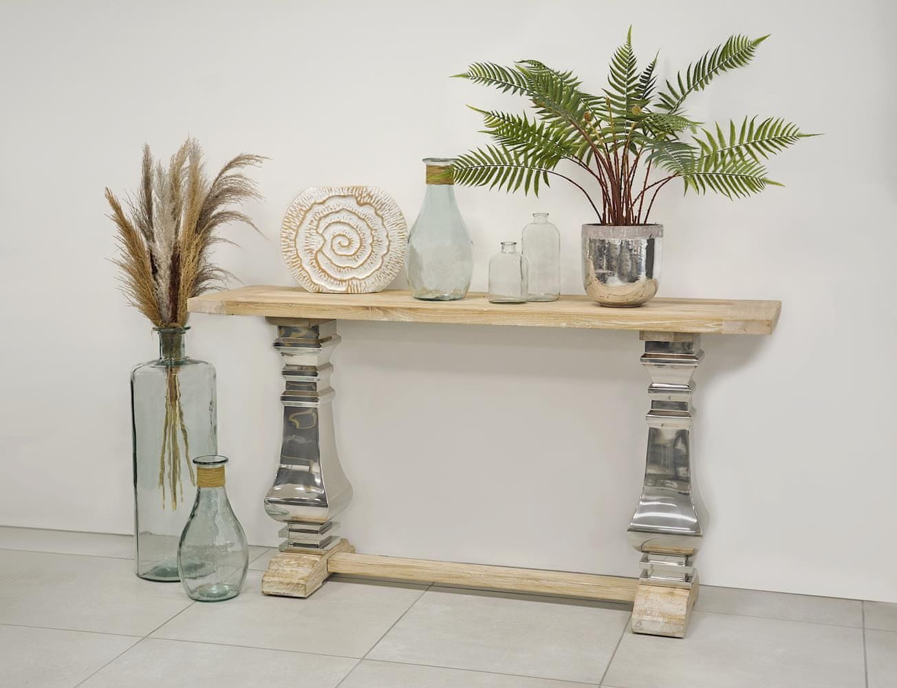 Stilska in moderna, ta konzolna miza v glamur stilu ima elegantno profilirane noge iz nerjavečega jekla. Površina in podnožje sta izdelana iz brušenega obnovljenega hrastovega lesa v svetlem, naravno beljenem odtenku, obogatena z dekorativnimi intarzijami. Ta kos je idealen za dodajanje pridih sofisticiranosti hodnikom, dnevnim sobam ali predprostorom.