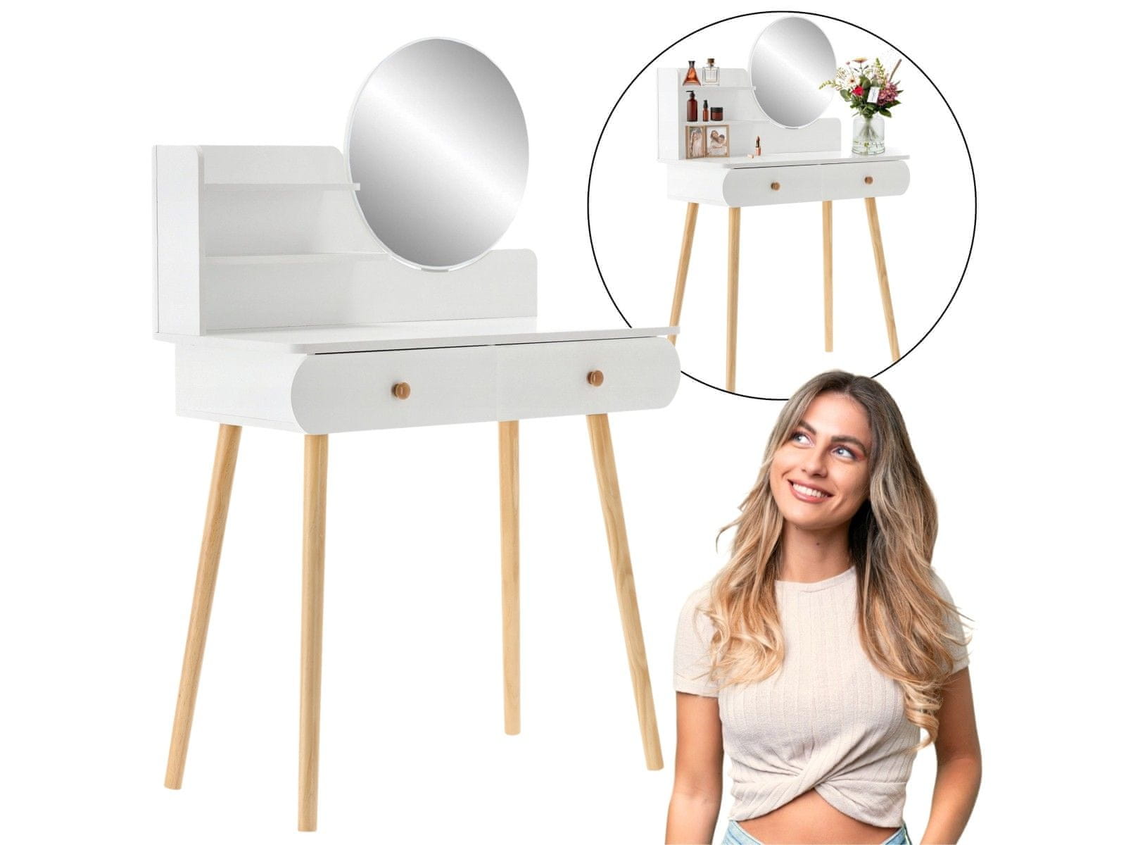 Moderna toaletna mizica v beli barvi, idealna za spalnico, garderobo ali dnevno sobo.Opremljena je z okroglim ogledalom, dvema prostornima predaloma in praktičnimi policami za shranjevanje kozmetike, nakita in okraskov.Minimalistična zasnova v skandinavskem slogu združuje belo barvo z naravnimi lese Celoten opis