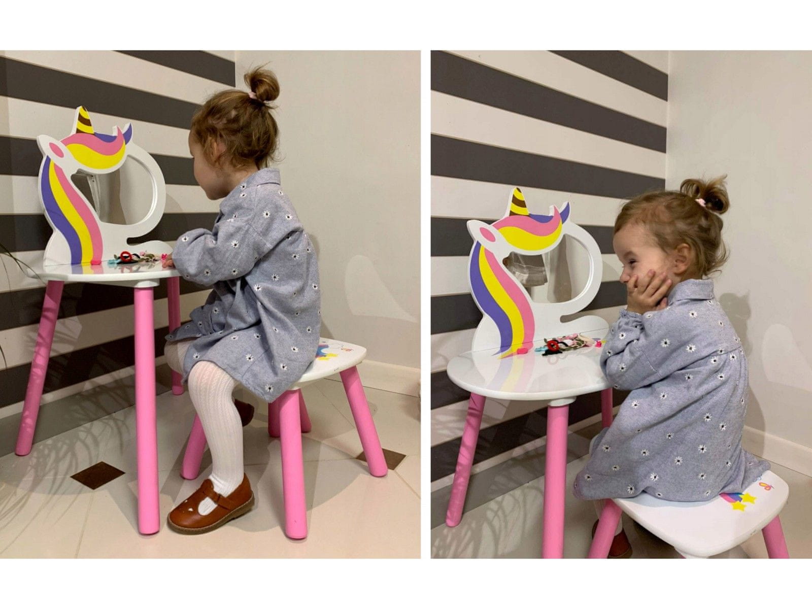 Ta čudovita belo-rožnata toaletna mizica s stolčkom je sanje vsake male princeske.Ogledalo je v okvirju v obliki pisanega enoroga, ki celoti doda edinstven čar. Priložen je tudi stolček, da lahko med ličenjem ali česanjem udobno sedite.Toaletna školjka je izdelana iz visokokakovostnih materialov, ki Celoten opis