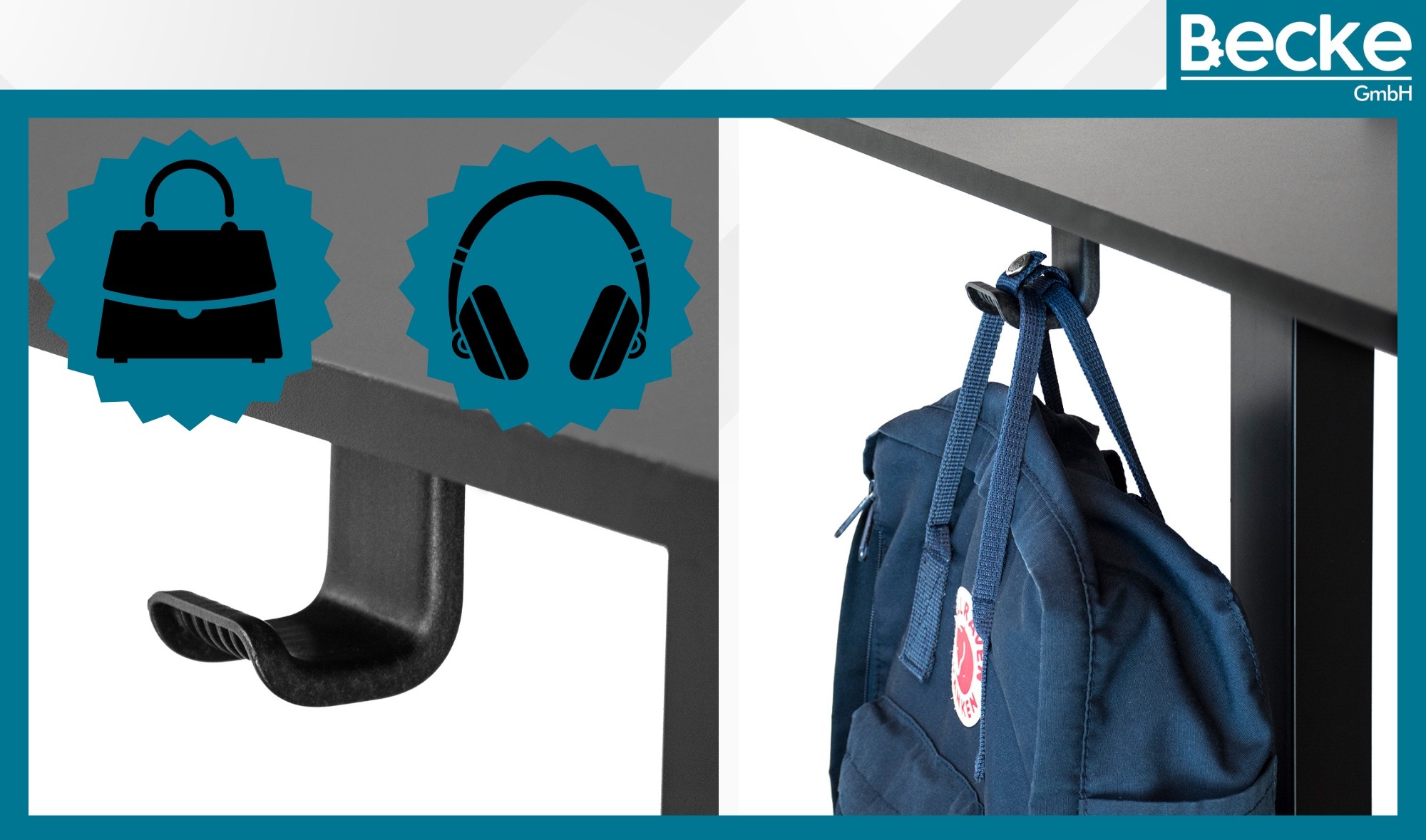 ✅ Dva kavlja , nameščena na obeh straneh mize, omogočata obešanje slušalk, torb ali drugih manjših predmetov, kar poveča funkcionalnost vašega delovnega mesta.