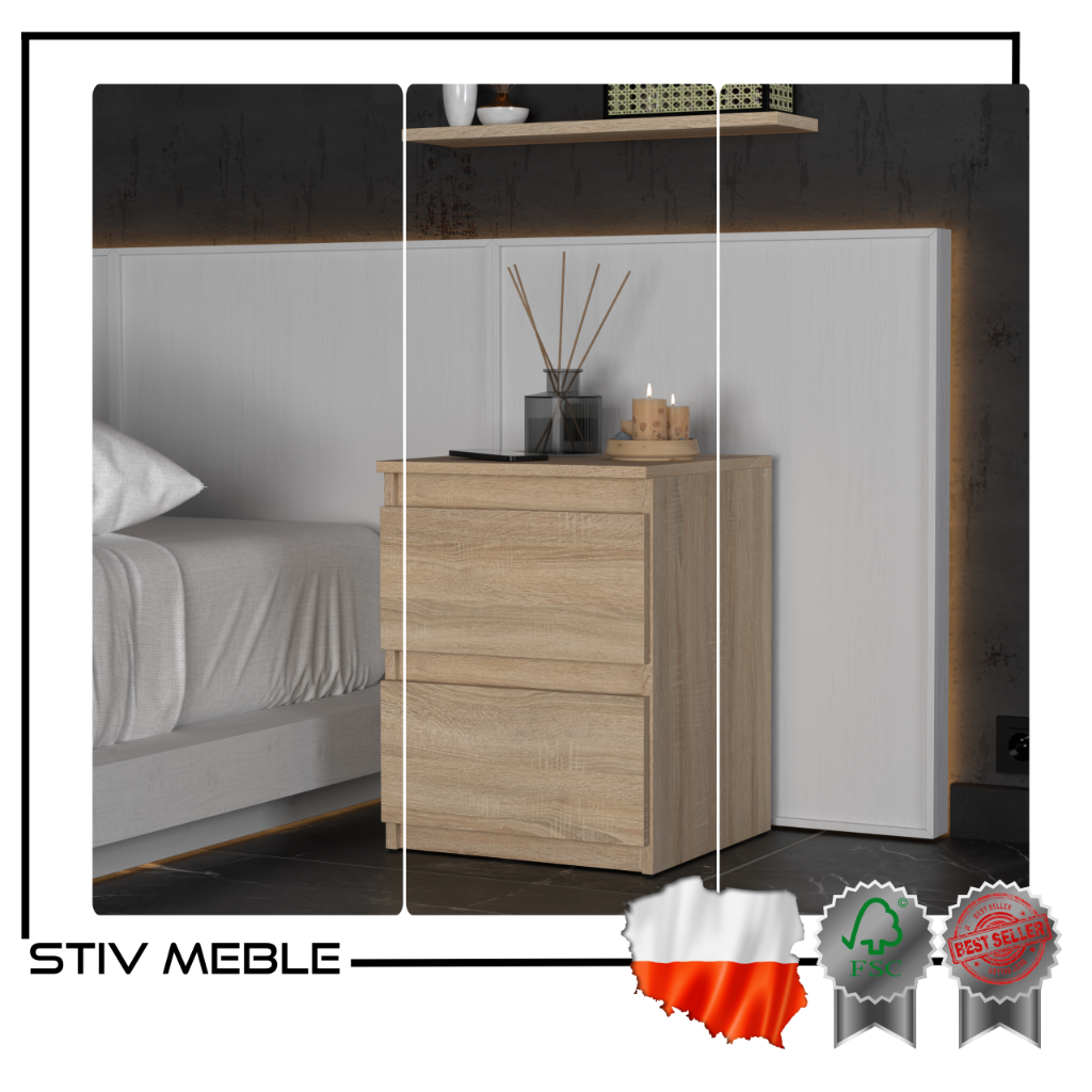 - Zakaj je nočna omarica z 2 predaloma dobra izbira? Konstrukcija je močna in izdelana iz visokokakovostne lamelirane plošče