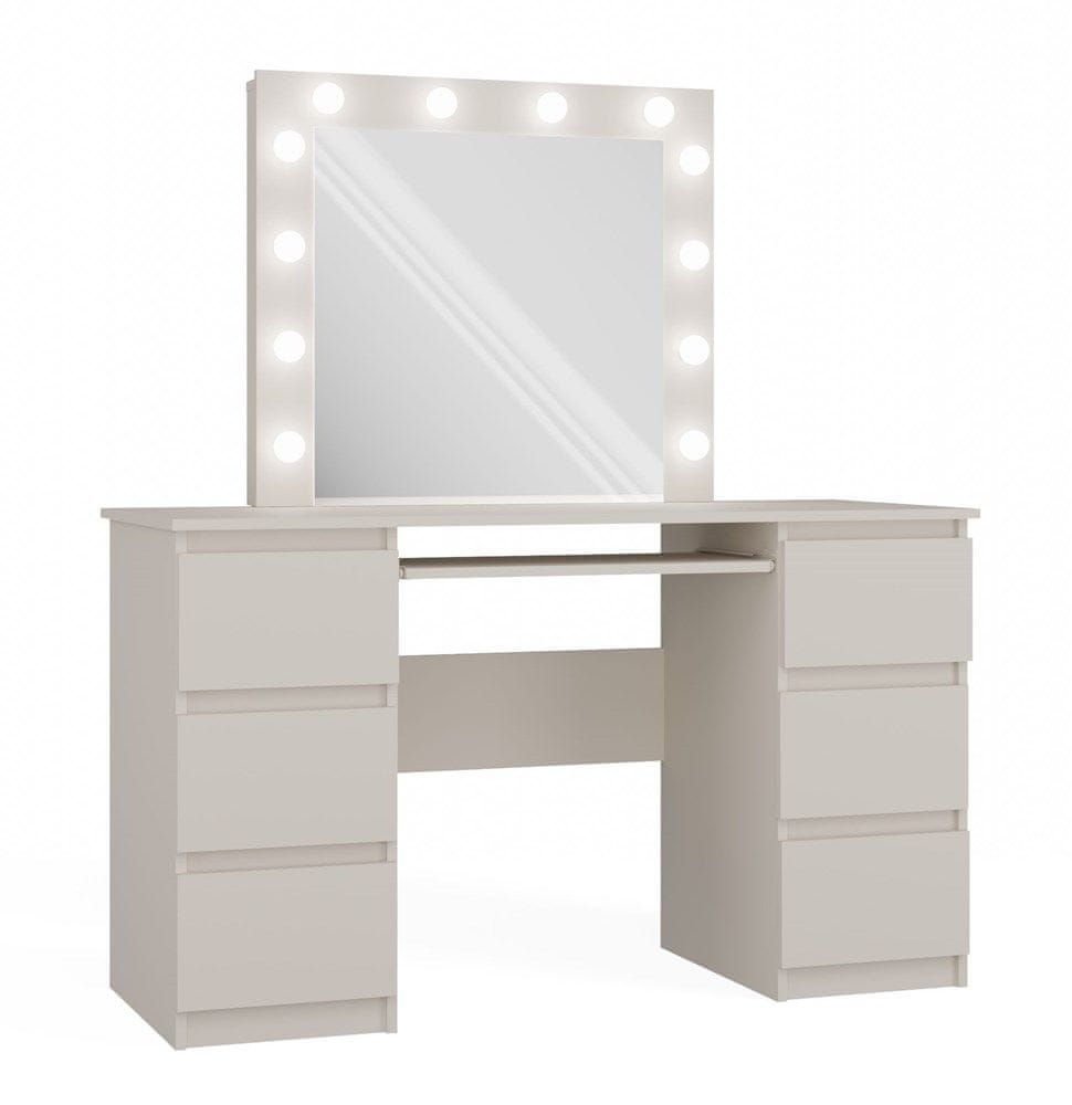 ELEGANTNA TOALETNA MIZICA Z OGLEDALOM IN SVETLOBO SERIJA: MARINA MODEL: KUBA + MARINA OGLEDALO BARVA: KAŠMIR Ekskluziven in eleganten odtenek bež Predstavljamo naš najnovejši dragulj v kroni – toaletno mizico, ki združuje eleganco, funkcionalnost in sodoben dizajn. Toaletna mizica z ogledalom in LED osvetlitvijo je idealen kos pohištva za ljudi, ki cenijo udobje in lepoto svojega okolja. Premišljen dizajn omogoča priročno shranjevanje kozmetike in nakita, lahko pa deluje tudi kot praktična pisalna miza. Značilnosti tega izdelka sta predvsem solidna izdelava in moderen videz v modni, a še vedno edinstveni barvi kašmirja. odtenek bež, ki notranjosti doda eleganco in edinstvenost. Toaletna mizica služi kot prostor za pripravo ličil in drugih lepotnih tretmajev ter kot funkcionalna pisalna miza. 6 prostornih predalov (3 predali na vsaki strani mize) Ogledalo opremljeno z energijsko varčno LED osvetlitvijo, ki zagotavlja idealne pogoje za ličenje in nego obraza. Osvetlitev je opremljena s stikalom za udobje uporabnika. Fronte predalov brez ročajev zagotavljajo udobno uporabo in poudarjajo modernistični značaj notranjosti. Zelo dobra izdelava poljskega proizvajalca