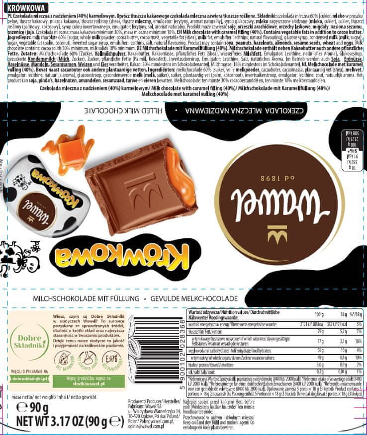 Sestavine Mlečna čokolada 60 % [sladkor, polnomastno mleko v prahu, kakavovo maslo, kakavova masa, rastlinska maščoba (karite), mlečna maščoba, emulgator: lecitini, naravna aroma], glukozni sirup, sladkano kondenzirano mleko (mleko, sladkor), sladkor, rastlinska maščoba (palma, kokos), invertni sladkorni sirup, emulgator: lecitini, sol, naravna aroma. Poleg kakavovega masla mlečna čokolada vsebuje tudi rastlinske maščobe. Mlečna čokolada: najmanj 30 % kakavovih delov, najmanj 18 % mlečnih delov.