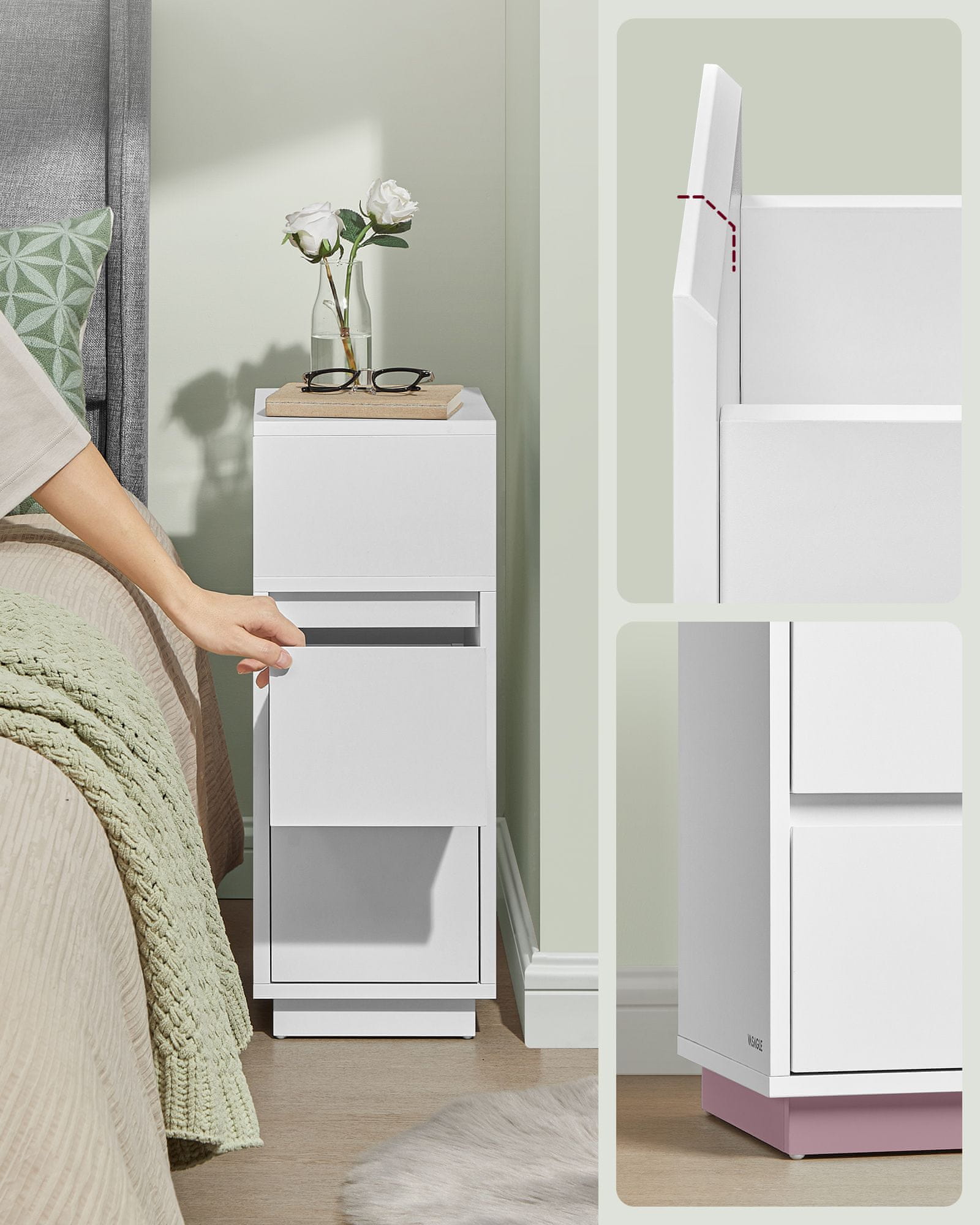 Ta ozek nočni omarica je zasnovana za maksimiranje shranjevanja in funkcionalnosti v majhnih prostorih. Zaradi ozkega profila je idealna za majhne spalnice dnevne sobe ali katerikoli prostor kjer je prostor omejen hkrati pa ponuja praktične rešitve za shranjevanje. Z možnostjo prilagodljive montaže in kombinacijo odprtih ter zaprtih predalov pomaga ohranjati vaše potrebščine organizirane in na dosegu roke.