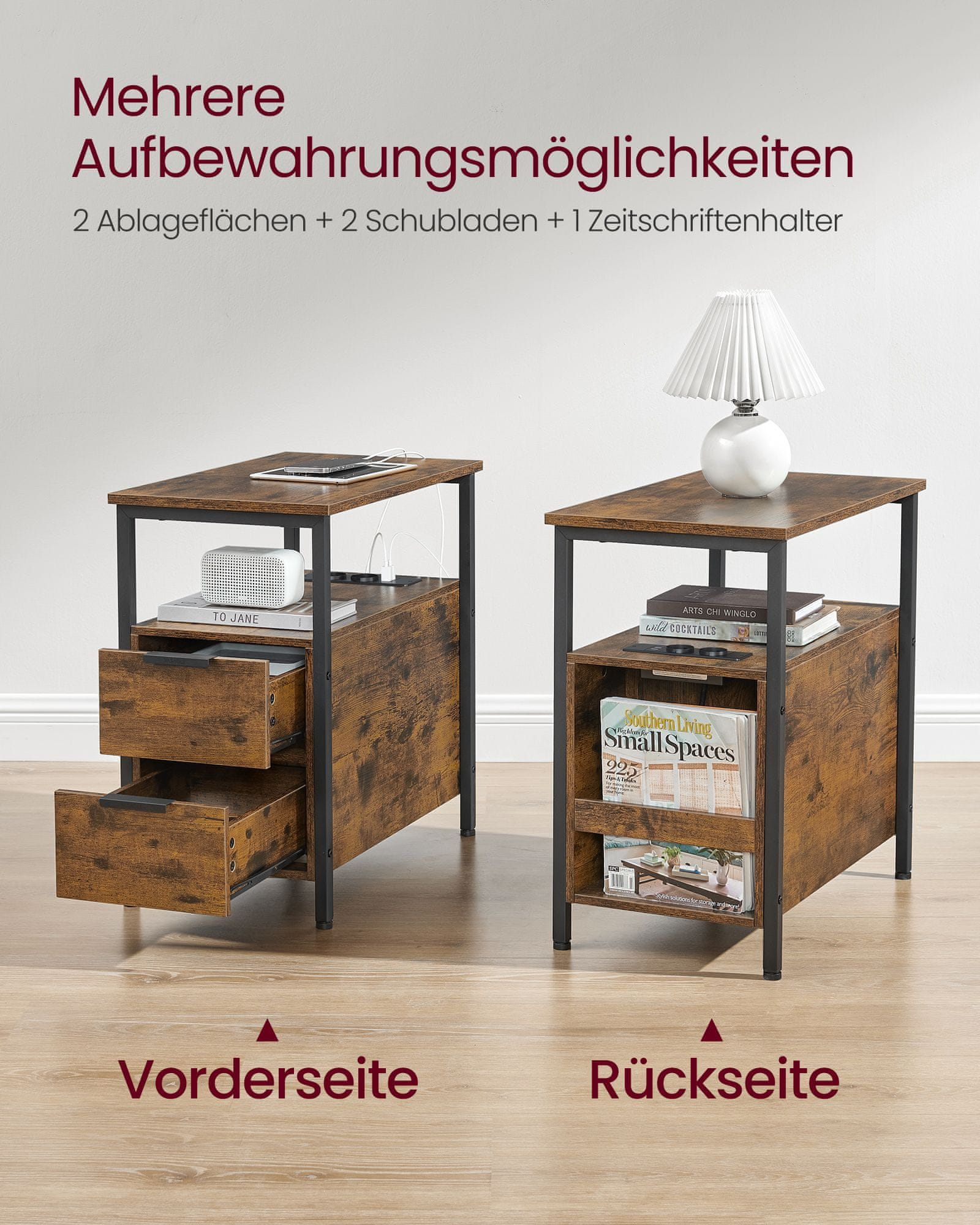 Ta vsestranska stranska mizica je zasnovana kot praktičen dodatek za vašo dnevno sobo ali spalnico. S svojim klasičnim vintage rjavim in črnim zaključkom dopolnjuje različne notranje stile ter ponuja priročne rešitve za shranjevanje. Idealna za uporabo kot nočna omarica ali mizica ob kavču vsebuje več predalov in predelkov ki pomagajo ohranjati vaš prostor urejen.