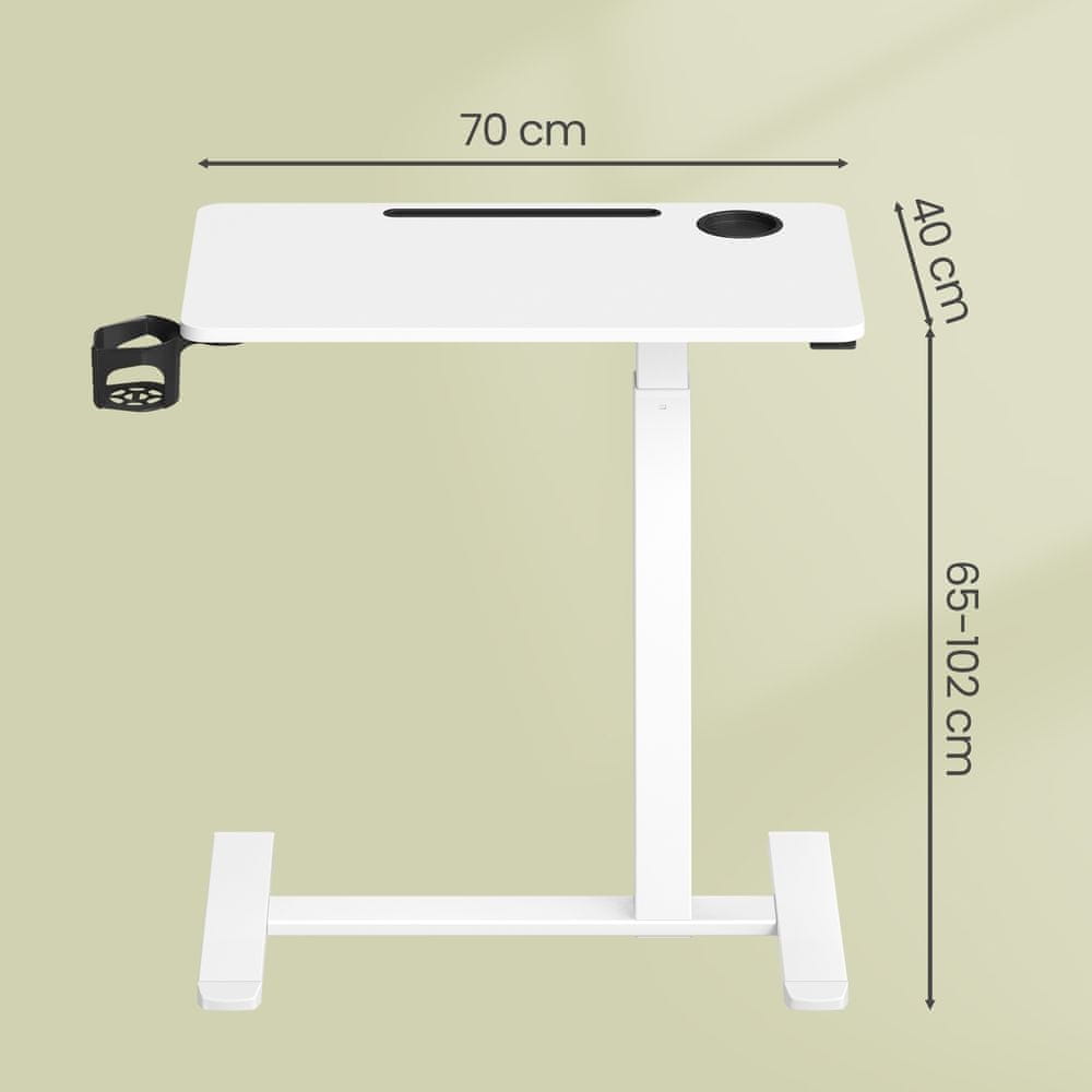 Ta mobilna stranska mizica je zasnovana za zagotavljanje vsestranske delovne površine ali priročne površine v vašem domu ali pisarni. Z nastavljivo višino in enostavnimi kolesci je lahko uporabljena kot stoječa miza za prenosnik ali voziček za postrežbo. Vgrajeni držalci za skodelice in režo za mobilne naprave dodajo dodatno funkcionalnost za vsakodnevno uporabo.
