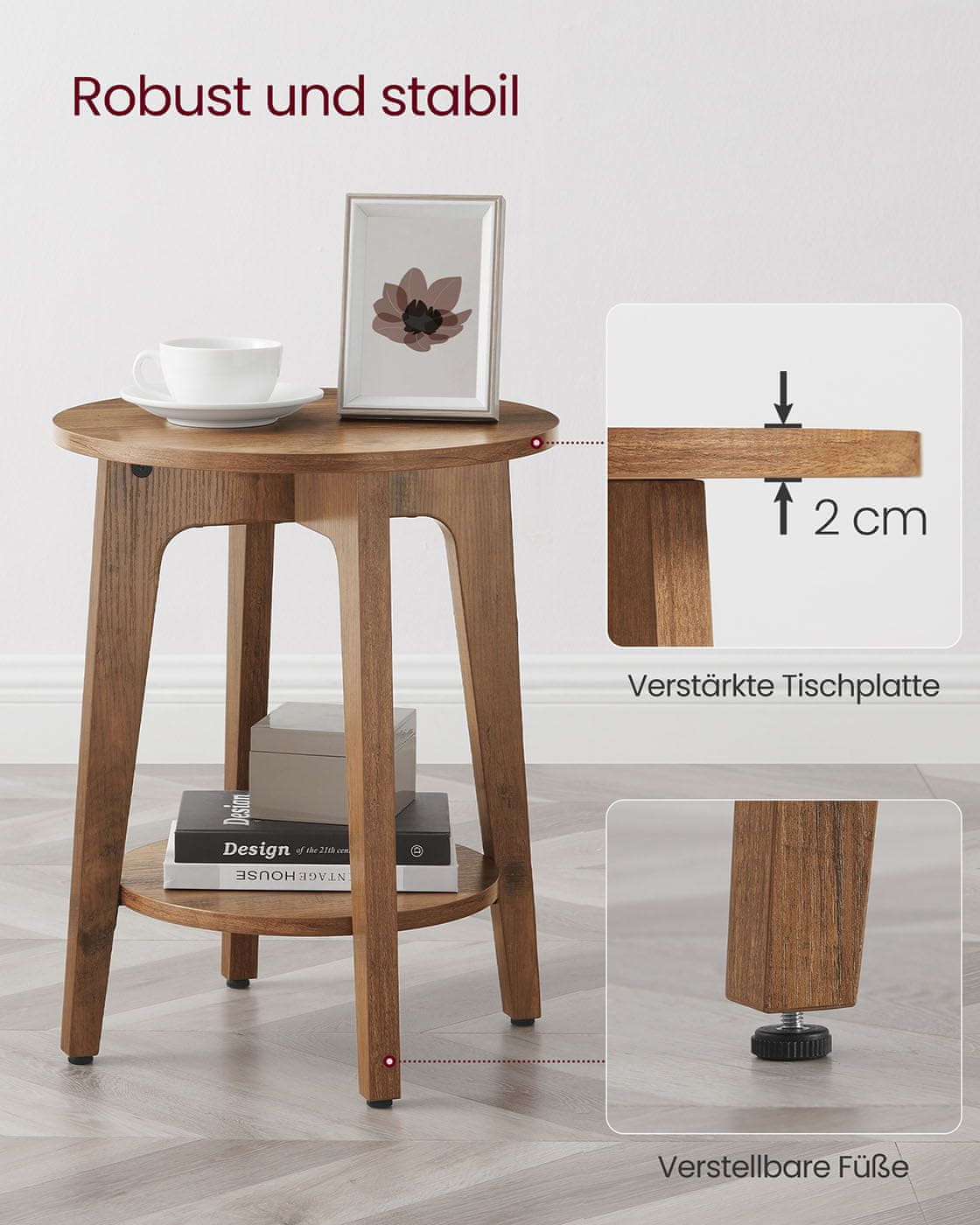 Ta majhna okrogla stranska mizica je idealen dodatek dnevnim sobam ali spalnicam saj nudi praktično površino za pijače knjige ali dekorativne predmete. Njena sodobna zasnova jo naredi primerno za majhne prostore kjer služi kot nočna omarica ali priročna poudarna mizica. Spodnja polica zagotavlja dodatni prostor za shranjevanje kar pomaga ohraniti vaš prostor urejen.