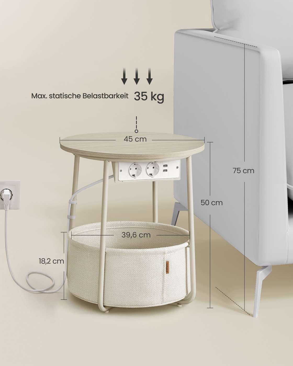 Ta sodoben okrogli stranski stolik ima praktično tkaninsko košaro za dodatno shranjevanje, zaradi česar je idealen za dnevne sobe ali spalnice. Njegova kompaktna zasnova ponuja stilsko rešitev za enostaven dostop do osnovnih stvari. Popoln kot kavna mizica ali nočna omarica. Celoten opis