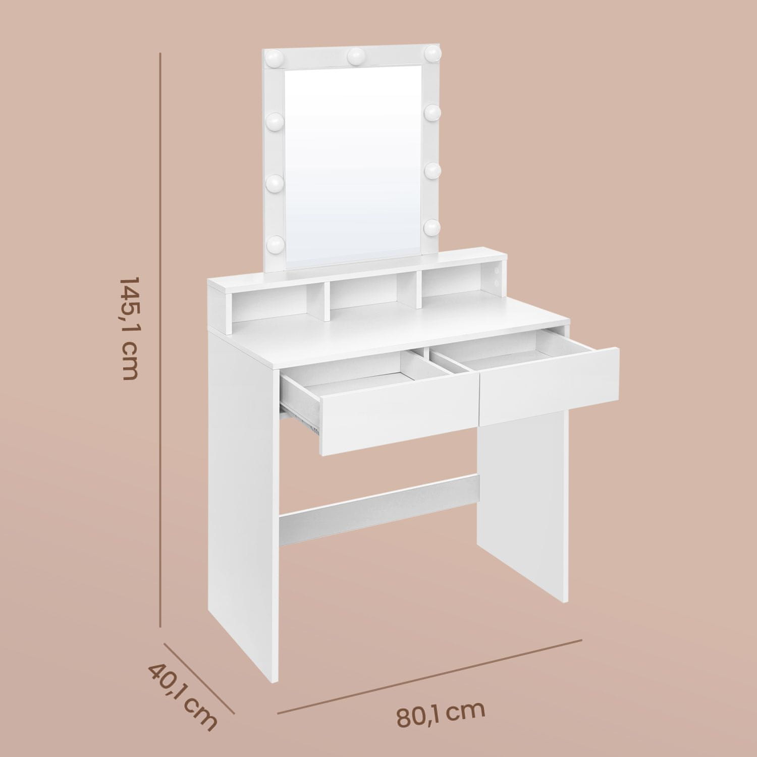 Ta moderni toaletka ima ogledalo z lučmi, prostorne predale in odprte predele, zaradi česar je idealna za organizacijo ličil in lepotnih pripomočkov. Popolna za dodajanje stila in funkcionalnosti vaši spalnici ali garderobni sobi. Celoten opis