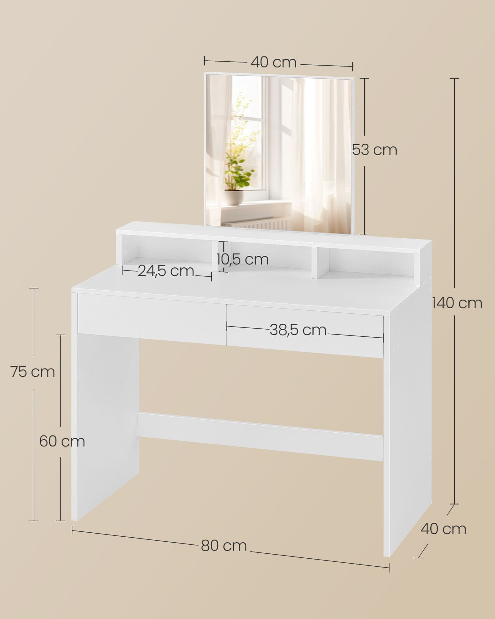 Ta moderna toaletna mizica je zasnovana za poenostavitev vaše vsakodnevne lepotne rutine in ponuja obilo prostora za shranjevanje kozmetike in dodatkov. Njena elegantna podoba in velik pravokoten ogledalo jo naredita stilsko in praktično dopolnilo vsaki spalnici. Površina, ki jo je enostavno čistiti, zagotavlja, da vaš prostor ostane urejen in prijeten, premišljena razporeditev pa omogoča enostaven dostop do vseh vaših potrebščin.