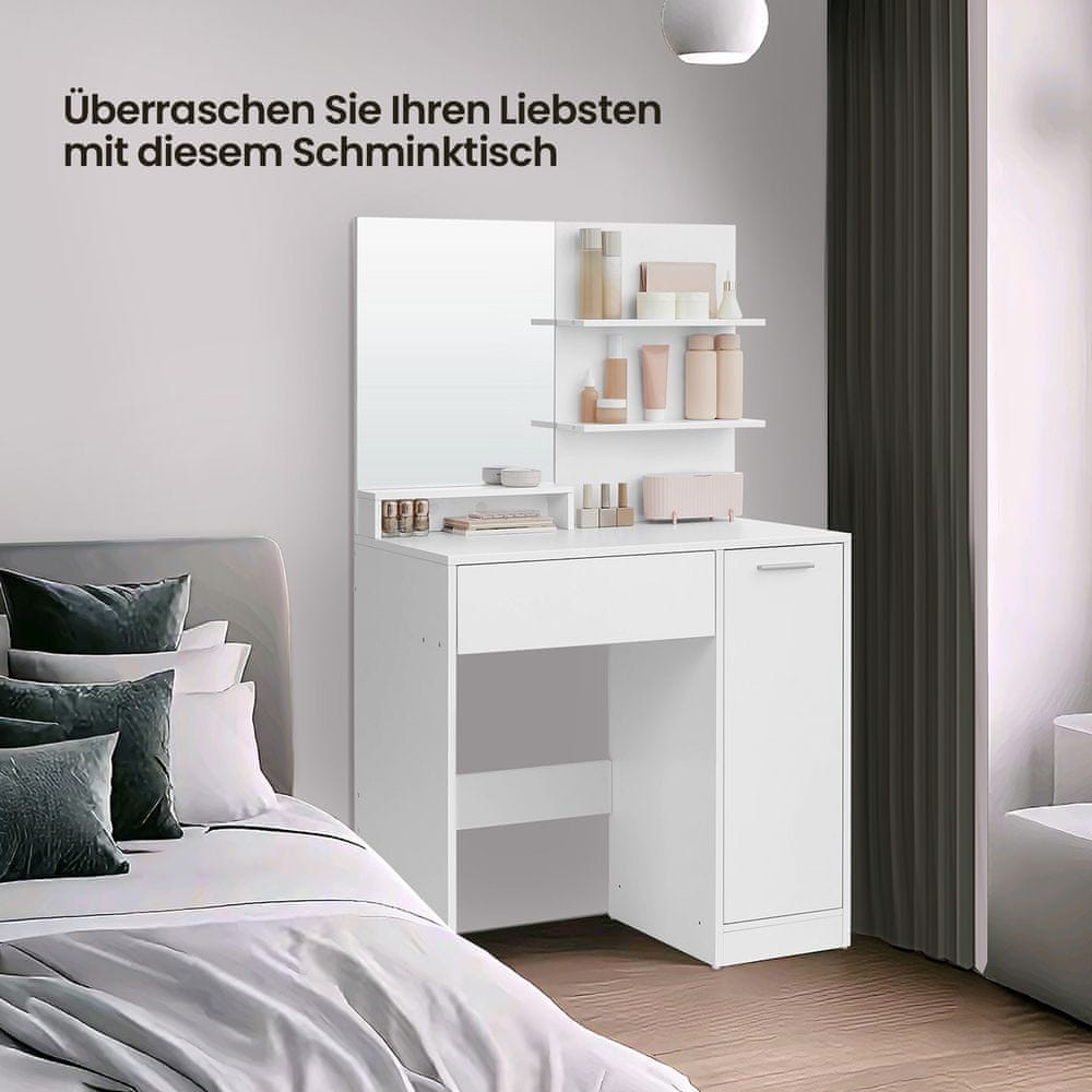 Ta toaletna mizica ponuja praktično rešitev za organizacijo vaših lepotnih pripomočkov in dodatkov. Oblikovana z ogledalom predalom in nastavljivimi policami zagotavlja tako funkcionalnost kot slog za vašo spalnico ali garderobo. Njegov sodoben videz jo naredi vsestransko dopolnilo različnim notranjim slogom.