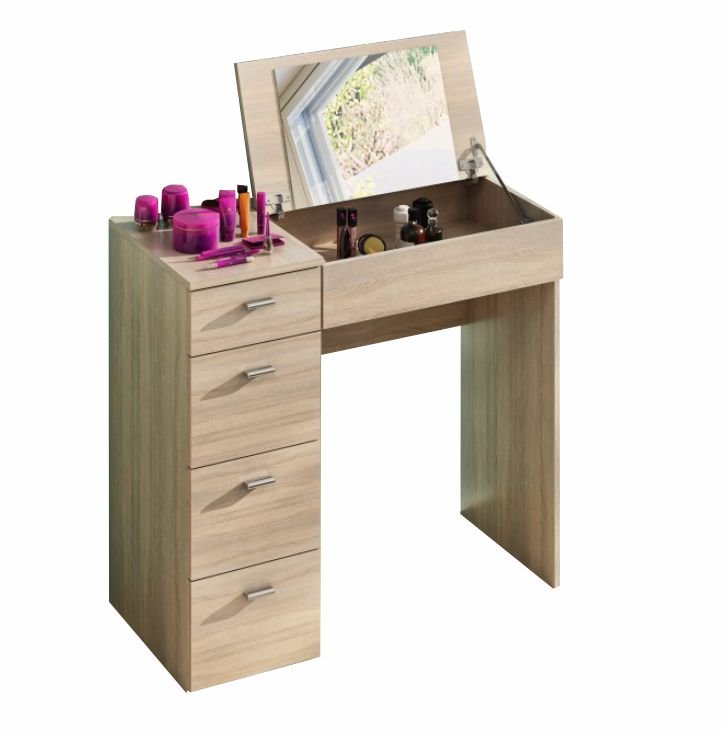 Toaletna mizica BELINA predstavlja malo kraljestvo polepšanja, s katerim boste imeli skupaj vso svojo kozmetiko in nakit. Očarala vas bo s svojo preprosto, a praktično obliko. Ponuja prostor za shranjevanje v obliki štirih predalov. Na zgornji plošči na tečajih boste na notranji strani našli ogledalo, v katerem bo vaša lepota izstopala v popolnoma novi luči. Miza je izdelana iz laminata DTD debeline 16 mm v barvi hrasta sonoma. Idealna lokacija toaletne mize je v spalnici. Priporočamo kombinacijo s spalnico Gabriela, tako da dobite en celostno moderen komplet. Če vam barva ne ustreza, lahko izbirate med drugimi barvnimi različicami v naši ponudbi. Dimenzije predala so 29,4×26×8,6 cm. Dimenzija ogledala je 42×30 cm. Dimenzije odlagalne površine za kozmetiko so 58,2×36,2×11,4 cm. Nosilnost tako mize kot predala je 5 kg.