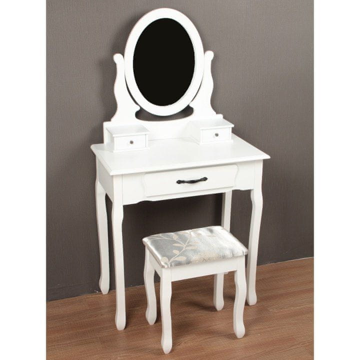Na sceno prihaja toaletna mizica s stolčkom v baročnem stilu LINET NEW. Navsezadnje vsaka ženska potrebuje svoj kotiček, malo kraljestvo, kjer počiva in razvija svojo ustvarjalnost. Miza je pripravljena za vse vaše zahteve in zahteve. Dimenzije mize so (ŠxGxV): 72×40×136 cm. Višina mize do vrha je 77 cm. Zaradi čistega dizajna belega MDF (lesno vlaknene plošče), masivnih lesenih nog in kovinskih ročajev je idealen kos za vašo spalnico. To, kar naredi toaletno mizico toaletno mizo, je nedvomno ogledalo, zahvaljujoč kateremu se boste lahko popolnoma prilagodili. Lepotni kotiček ne bi bil kraj udobja in sprostitve, če bi morali stati ob njem. Zato je Linet New opremljen s pametnim stolčkom. Majhen štirinožni dragulj, oblečen v srebrno-zlato obleko iz 100% poliestra. Dimenzije tabureja so (ŠxGxV): 38×28×45 cm. Nosilnost mize je 100 kg, nosilnost tabureja pa 90 kg. Pameten pomočnik in organizator vseh vaših malenkosti bo našel mesto v srcu vsake ženske.