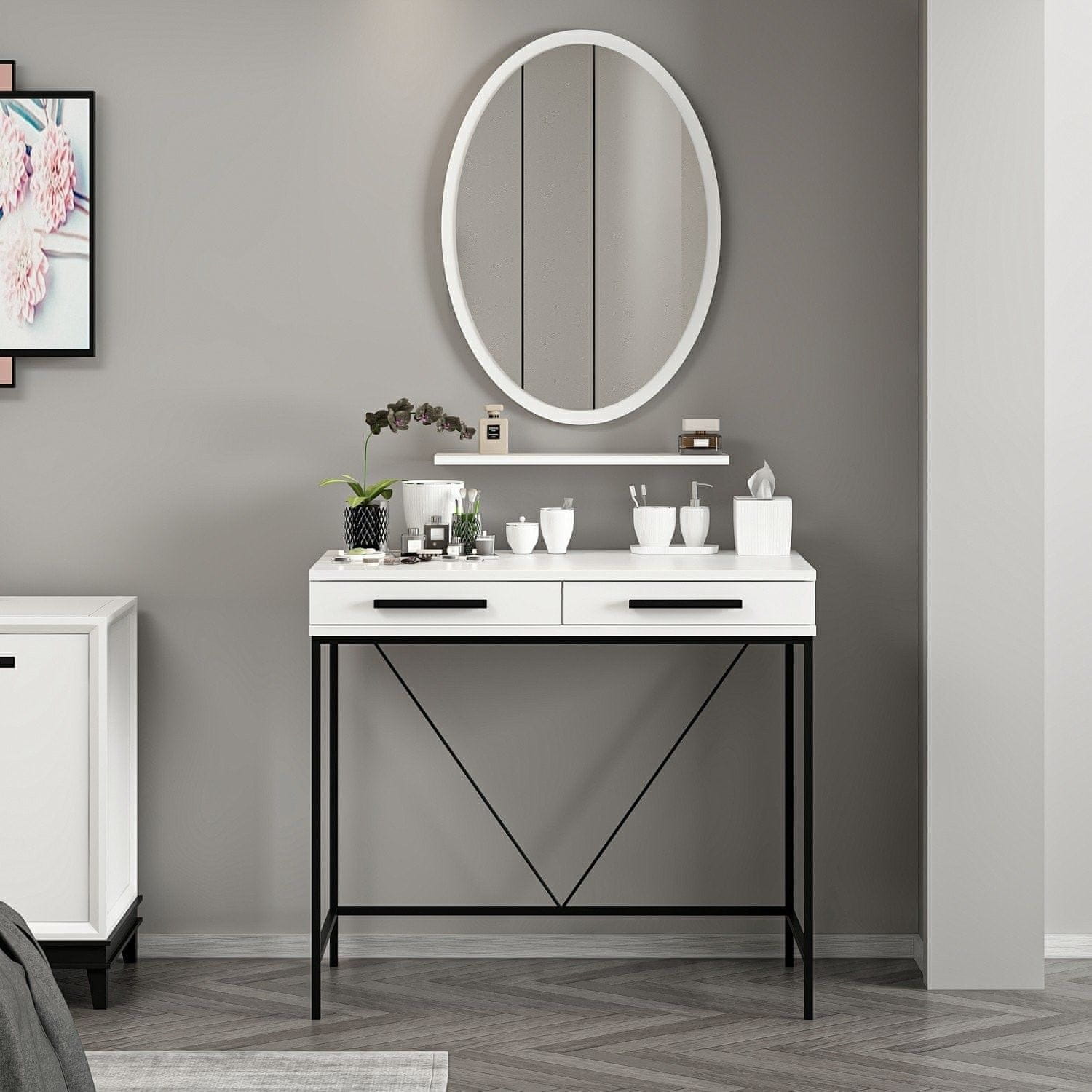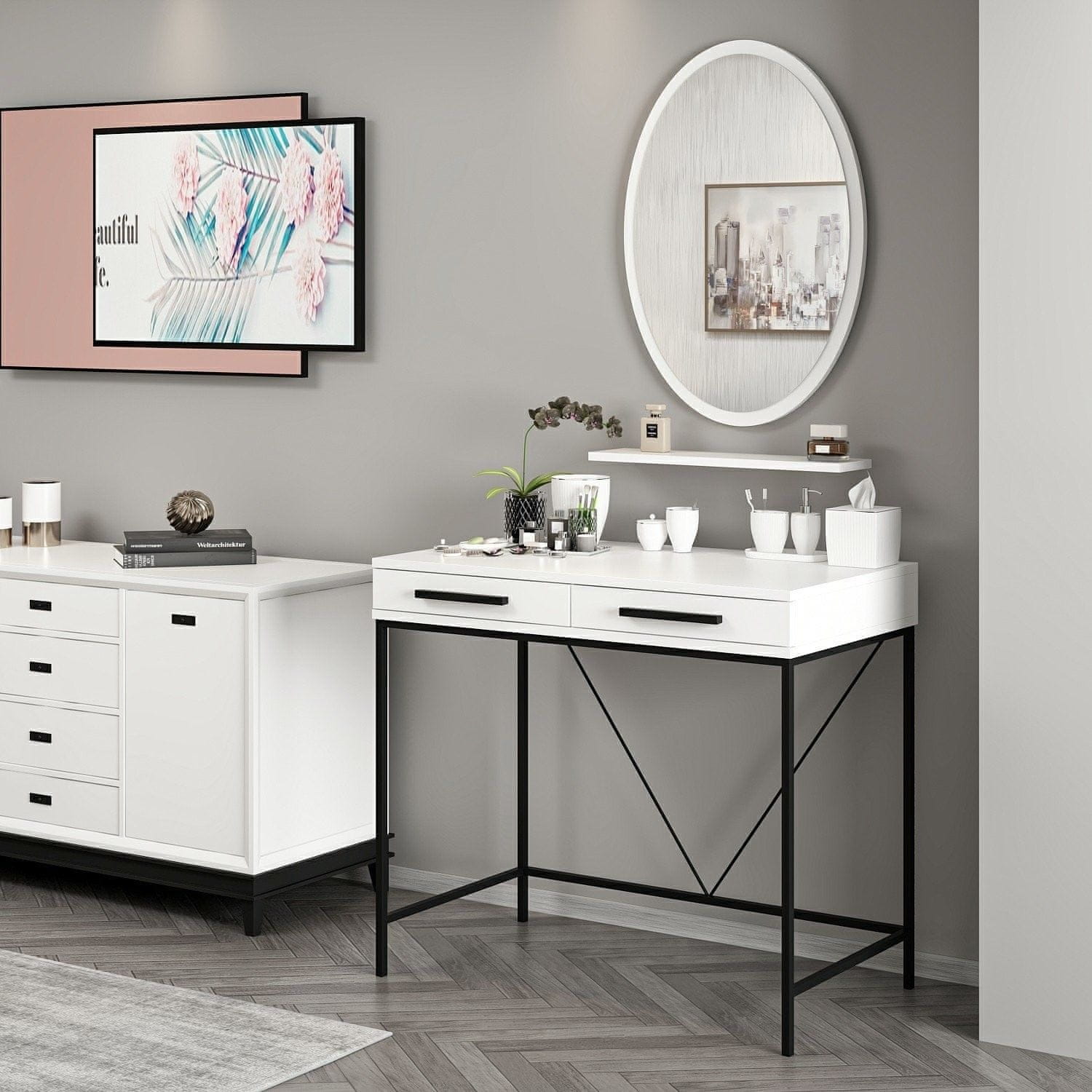 100 % MELAMINSKO PREVLEČENA IVERNA PLOŠČA Debelina: 18 mm Velikost mize: Širina: 90 cm Višina: 80 cm Globina: 45 cm Velikost ogledala: Širina: 58 cm Višina: 82 cm Globina: 2 cm Število paketov: 2 68 × 92 × 5 cm / 10 kg (1 kos) 53,5 × 99 × 10 cm / 19,85 kg (1 kos)