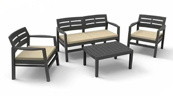 Vrtna garnitura Java vključuje mizo, dva udobna stola in dvosed iz trpežne plastike z blazinami.
