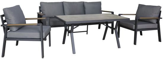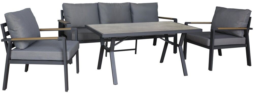 Luksuzen aluminijast komplet Sibiu združuje eleganten grafitni okvir, sodobne linije in trpežne materiale za dolgo življenjsko dobo. Mizna plošča iz aluminija in smole v temno sivem kamnitem vzorcu ustvarja prefinjen videz, ki se odlično poda tako na teraso ali vrt kot tudi v notranje prostore. Nasloni za roke v videzu lesa dodajo toplino in estetski kontrast celotni zasnovi.