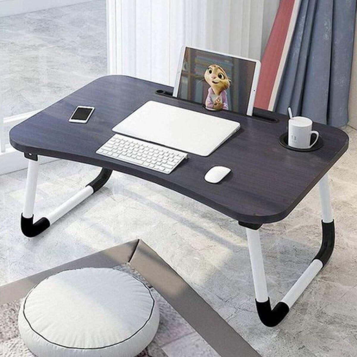 Zahvaljujoč mizi lahko delate kjerkoli: na postelji, kavču, fotelju. Mizica je opremljena s prostorom za skodelico in tablico . Na mestu za tablico je bila nameščena luknja , ki nam bo omogočila, da vodimo polnilnik.