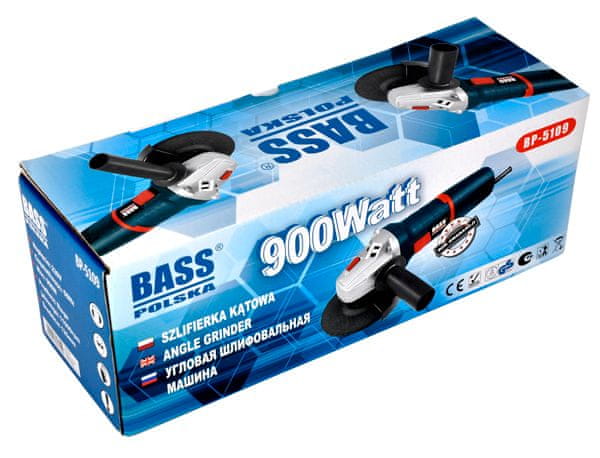 • Kotni brusilnik Bass Polska z močjo 900 W je nepogrešljiv kos opreme za vsako garažo ali delavnico.
