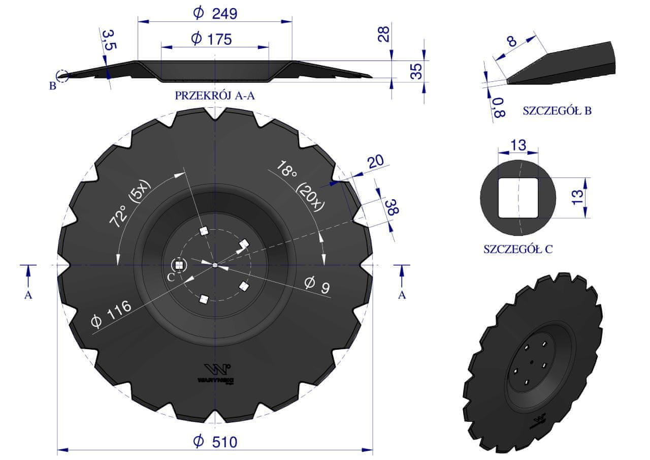 Zobata plošča Z-20 fi 510 montaža 5/116 stisnjena debelina 4 mm borovo jeklo WARYŃSKI R aplikacija AU/362–510/ 5 Celoten opis