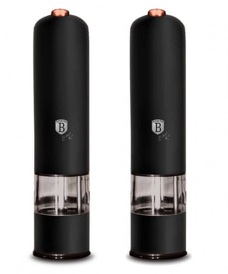 Komplet električnih mlinov za poper in sol iz kakovostnega črnega nerjavečega jekla iz linije BLACK ROSE. Brusilniki, ki jih napajajo 4 baterije AAA (niso priložene) z LED osvetlitvijo. Eleganten dizajn in keramične drgnjenja omogočajo, da je izdelek trpežen in trden.