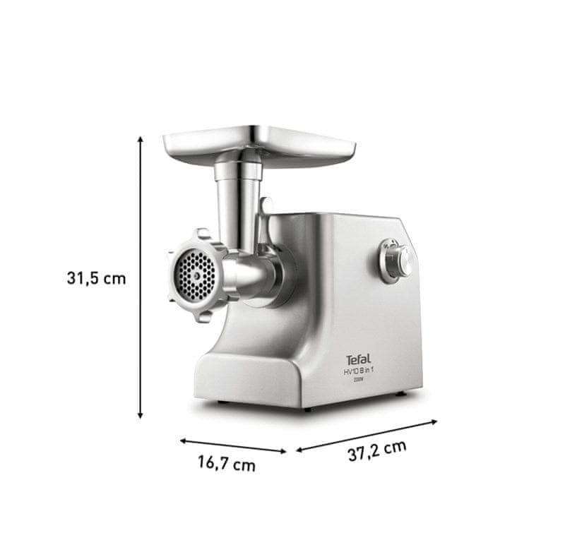 Mlinček Tefal NE858D38 je odlična izbira za vse, ki iščejo zanesljivo in zmogljivo napravo za mletje mesa. S svojo močjo 2200 W omogoča hitro obdelavo do 5,5 kg mesa na minuto, kar pomeni, da lahko hitro pripravite mesne zmes in druge specialitete. Njegova srebrna barva in trdna kovinska konstrukcija zagotavljata dolgotrajno uporabo in enostavno čiščenje.
