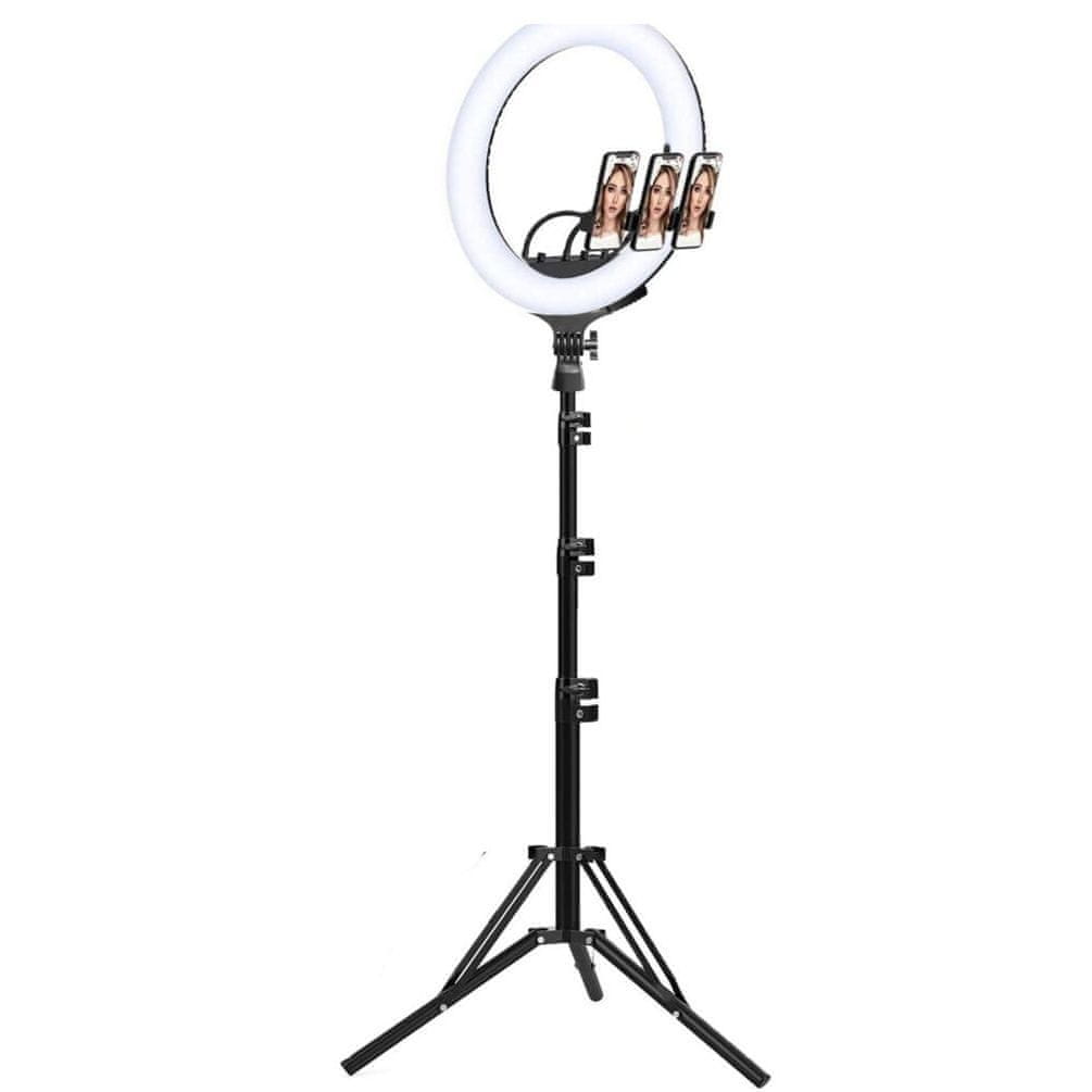 Selfie Ring Light – 3 načini osvetlitve, nastavitev jakosti svetlobe, 3 držala za mobilni telefon, držalo z ogledalom, višina stojala 64 cm – 210 cm, zunanji premer svetilke 45 cm, zagotavlja enakomerno osvetlitev. Celoten opis