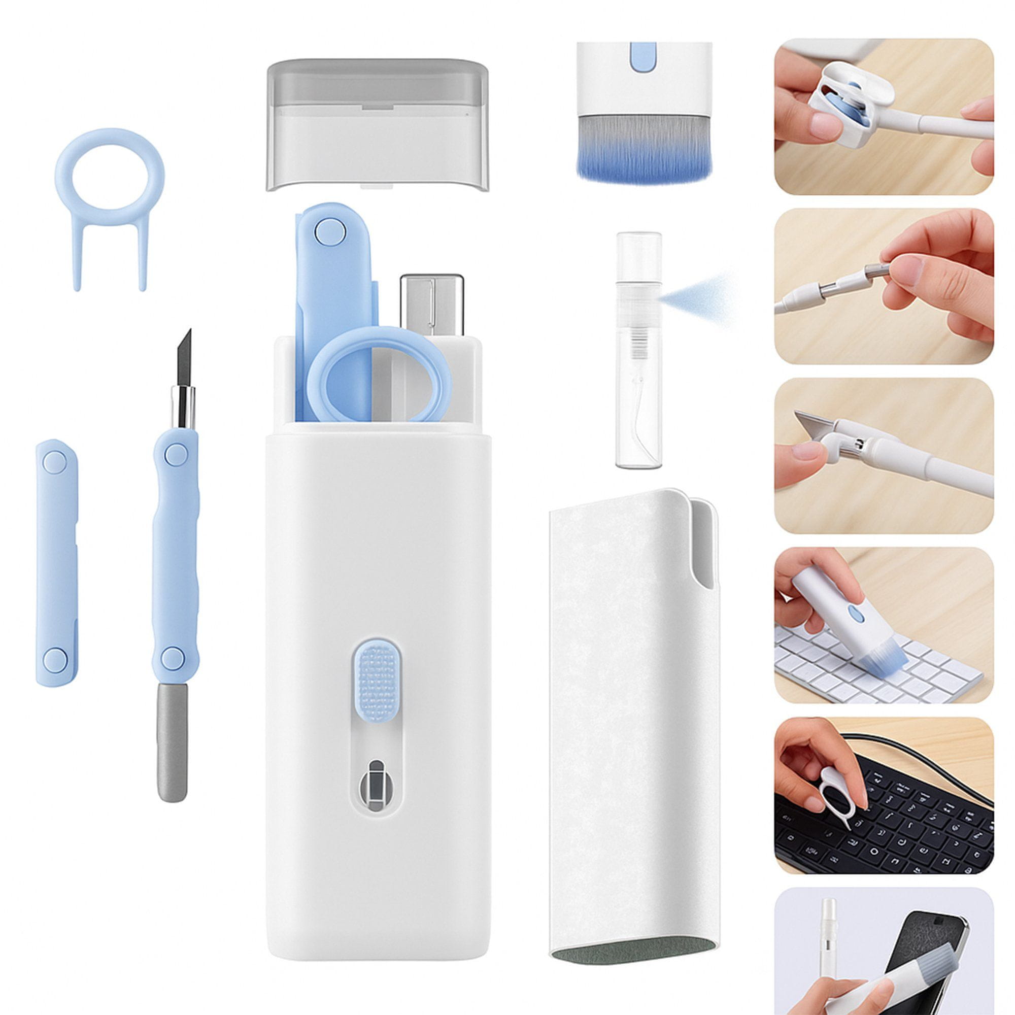 To 7-v-1 večnamensko čistilo je bistveno orodje za vsak dom in pisarno. Z različnimi nastavki lahko temeljito očistite svoje elektronske naprave, s čimer zagotovite njihovo dolgo življenjsko dobo in estetski videz. Ne glede na to, ali želite odstraniti prah s prenosnika ali se znebiti mastnih prstnih odtisov na zaslonu telefona, bo ta čistilni komplet kos vsakemu izzivu!