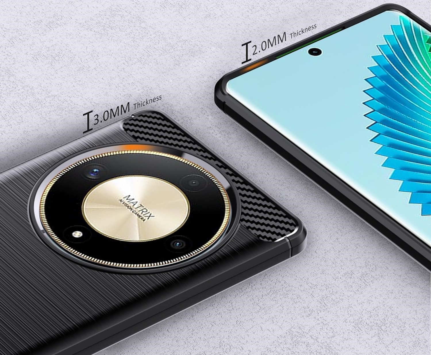 Robovi, ki štrlijo nad zaslonom, preprečujejo stik s površino, na kateri je telefon. Karbonska struktura zagotavlja eleganten in moderni videz.