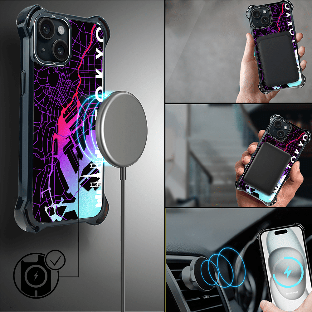 shumee Ovitek IBIZU DropGuard Ultra za iPhone 15 z MagSafe, zemljevidi sveta, Tokio