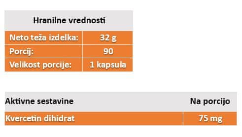 Ena kapsula vsebuje 75 mg kvercetin dihidrata iz japonske sofore (Sophora japonica). Za to obliko kvercetina sta značilni dobra stabilnost in biološka uporabnost. Ne vsebuje glutena, laktoze, umetnih barvil ali konzervansov. Primerno za vegane in vegetarijance.