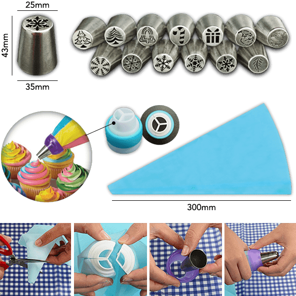Komplet vsebuje šobe s prazničnimi motivi, s katerimi lahko dobrote okrasite kot profesionalci.
