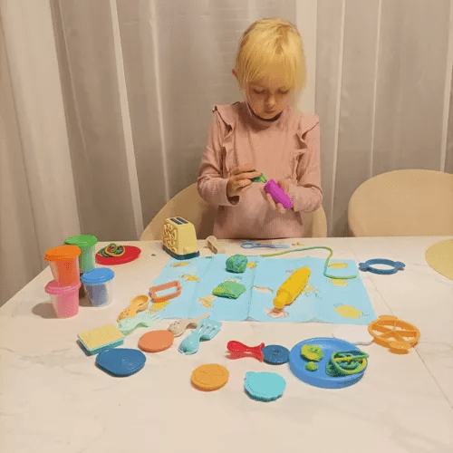 Odkrijte veselje ustvarjalne igre z našim velikim kompletom za pripravo testenin, tosterjem in plastelinami! Toster je varna, neelektrična igrača, ki posnema pravi toaster in otrokom omogoča ustvarjanje okusnih „toastov“ iz plastelina. Komplet vsebuje pet različnih barv plastelinov, ki jih je možno kombinirati, s čimer otroci spodbujajo svojo domišljijo in ustvarjalnost. Poleg toasterja v paketu najdete tudi široko paleto dodatkov, kot so nož, vilice, žlica, krožniki, valjar z vzorci, modelčki in imitacije hrane, kar odpira možnosti za neskončno ustvarjanje hrane, živali in likov.
