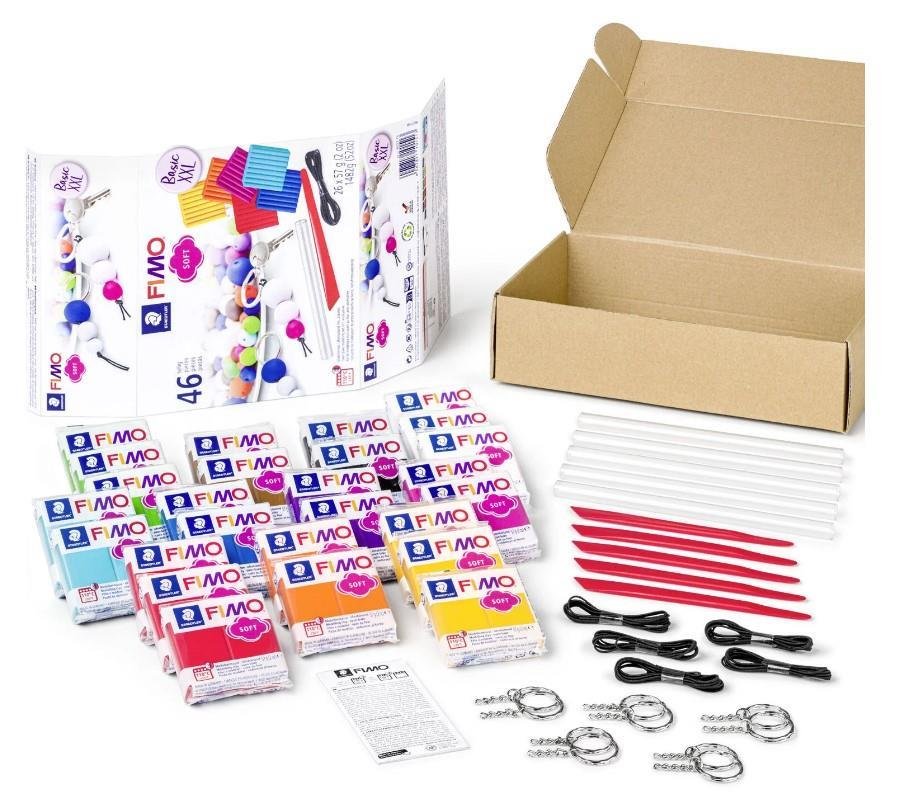 Set vsebuje: 26 kosov Fimo Soft polimerne barve 57 g (3× bela 0, 3× rumena 16, 2× oranžna 42, 3× rdeča 24; 2× malina 22, 2× vijolična 63, 2× modra 37, 2× turkizna 39, 3× zelena 53, 2× rjava 7, 2× črna 9) 10 modelirnih orodij (5× modelirka, 5× valjar) 5 elastičnih niti 5 nastavkov za izdelavo … Celoten opis