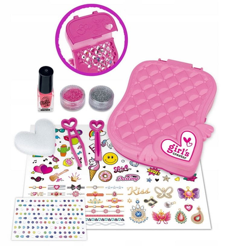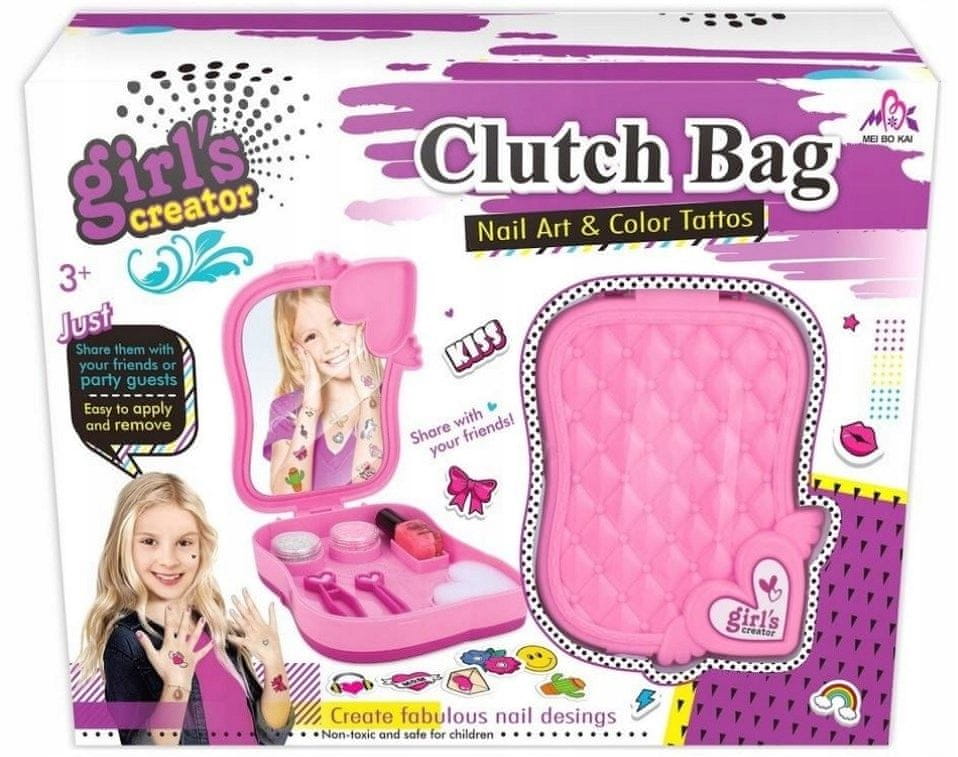 Vključuje škatlo za shranjevanje z ogledalom, lakom za nohte (enostavno odstranjevanje), bleščicami, pinceto, gobico, nalepkami za nohte, tetovažami